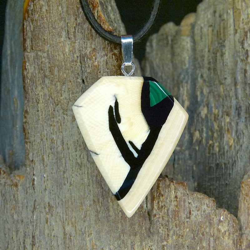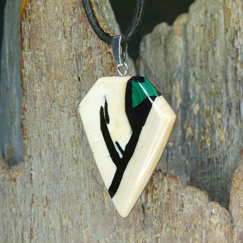 Kantig geschliffener Anhänger aus cremigem leicht geflecktem Mammut-Elfenbein mit feiner Maserung. Als Intarsie wurde zusätzlich ein grüner rekonstruierter Malachit eingearbeitet.