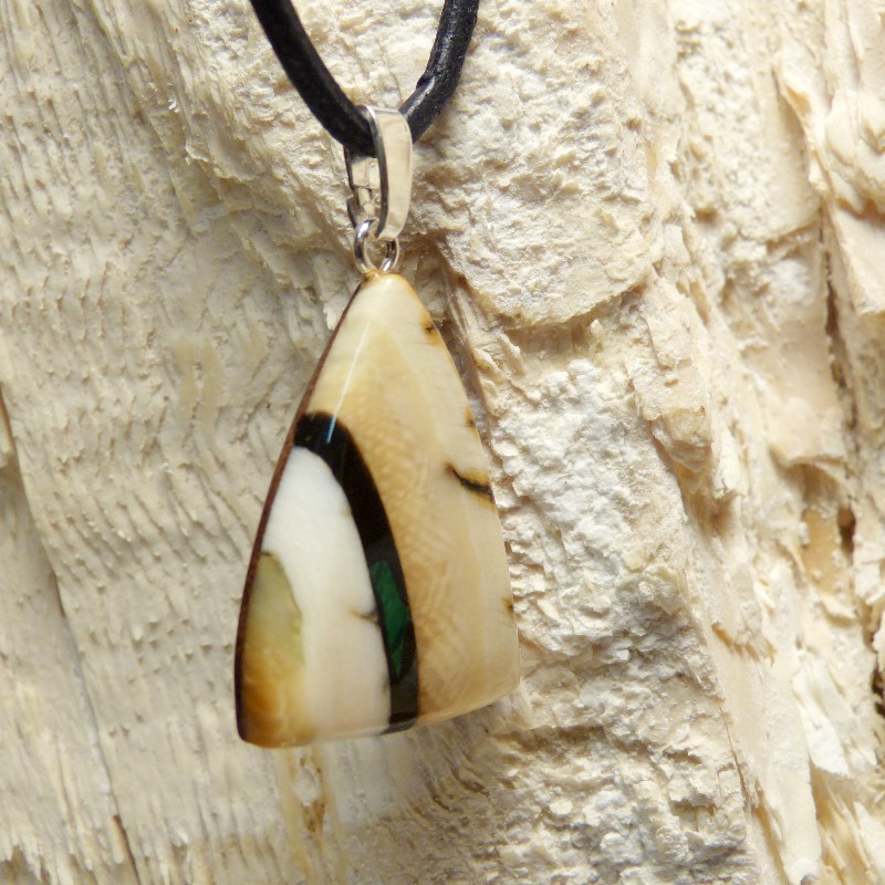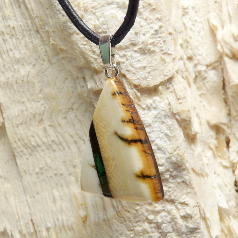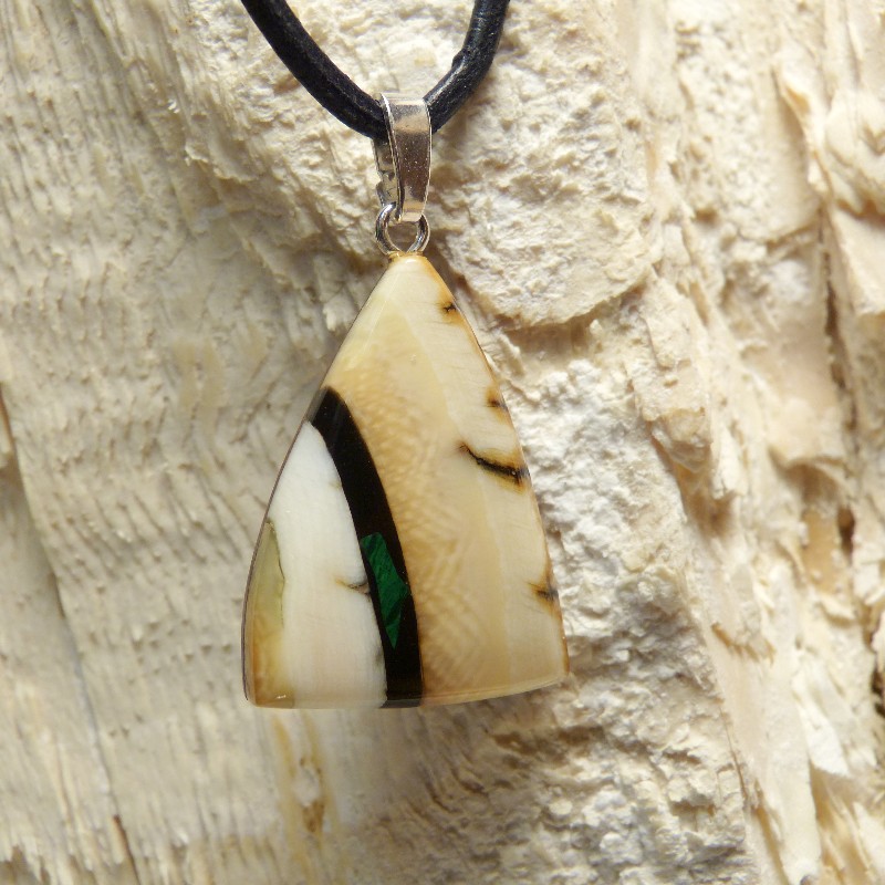 Mammut-Elfenbein mit schöner Außenrinde. Als Intarsie wurde zusätzlich ein kleiner rekonstruierter Malachit eingearbeitet. Die Größe