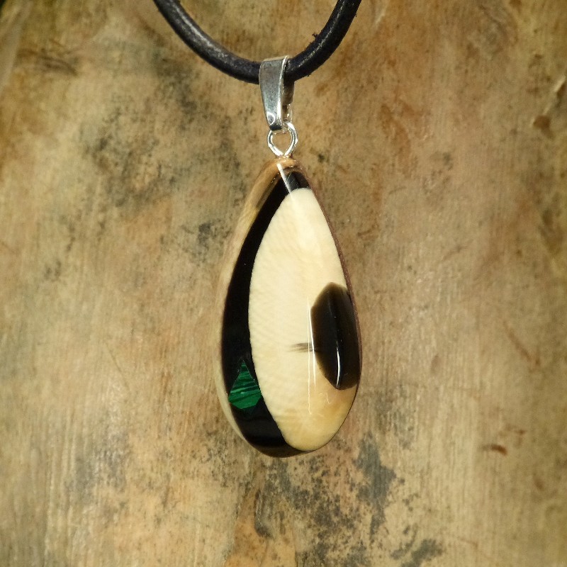 Kleiner Tropfen-Anhänger aus cremefarbenem Mammut-Elfenbein mit einer zusätzlichen Intarsie aus rekonstruiertem Malachit. Der Anhänger hat eine Größe von ca. 30 x 16 mm (ohne Öse) und wurde zur Stabilisierung mit Nussbaumholz hinterlegt. Die Öse aus 925/-er Silber ist geeignet für Ketten oder Bänder bis zu einer Größe von ca. 2,5 mm. Die Lieferung erfolgt ohne Band, dieses können Sie unter Zubehör separat bestellen.