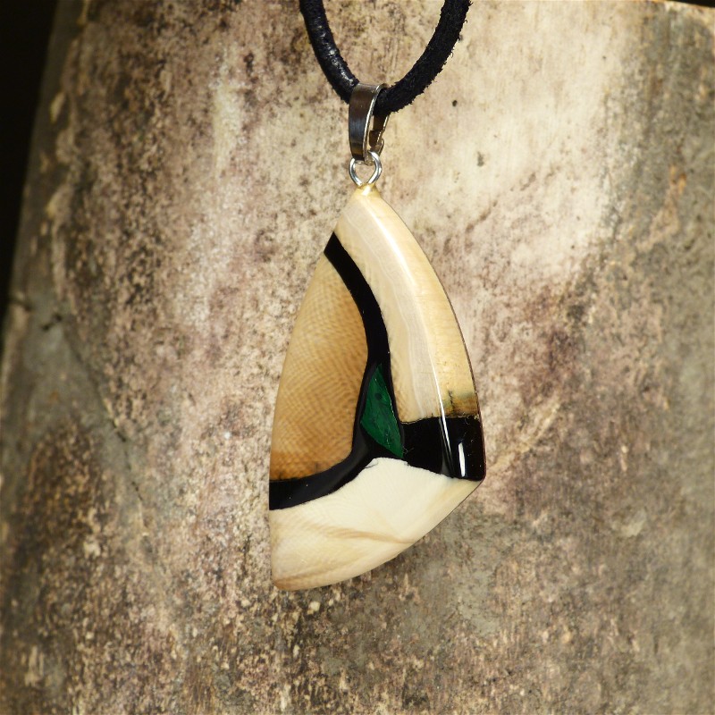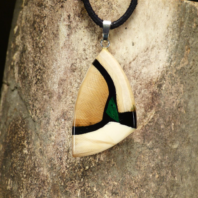 Fein gemaserter Anhänger aus hellem, cremefarbenem und braunem Mammut-Elfenbein sowie einer Intarsie aus