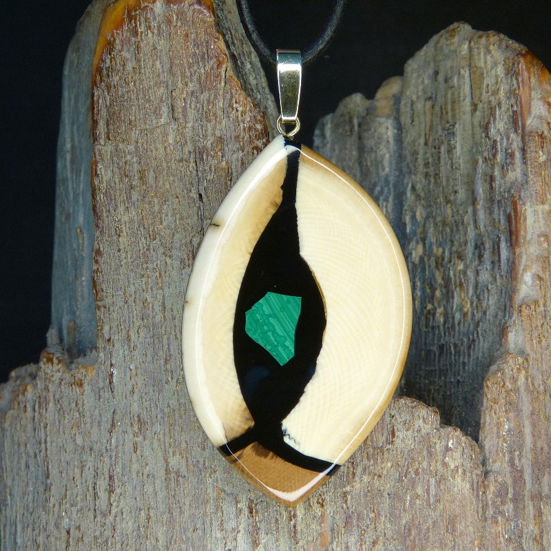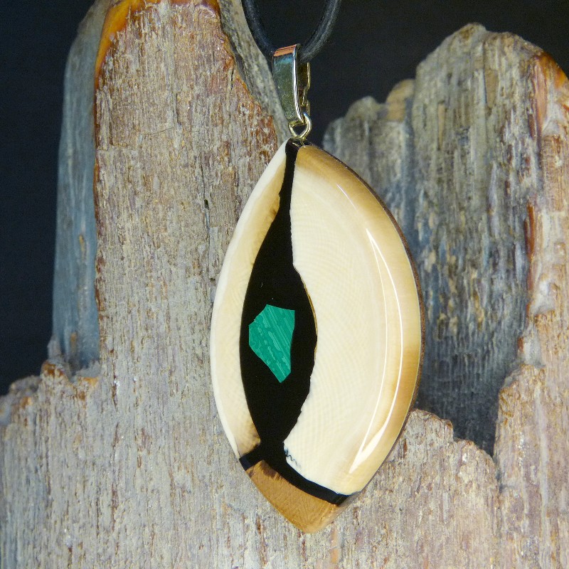 Auffälliger Anhänger aus cremigem und braunem Mammut-Elfenbein mit feiner Maserung und leichter Rindenfärbung. Als Intarsie wurde zusätzlich ein grüner rekonstruierter Malachit eingearbeitet.