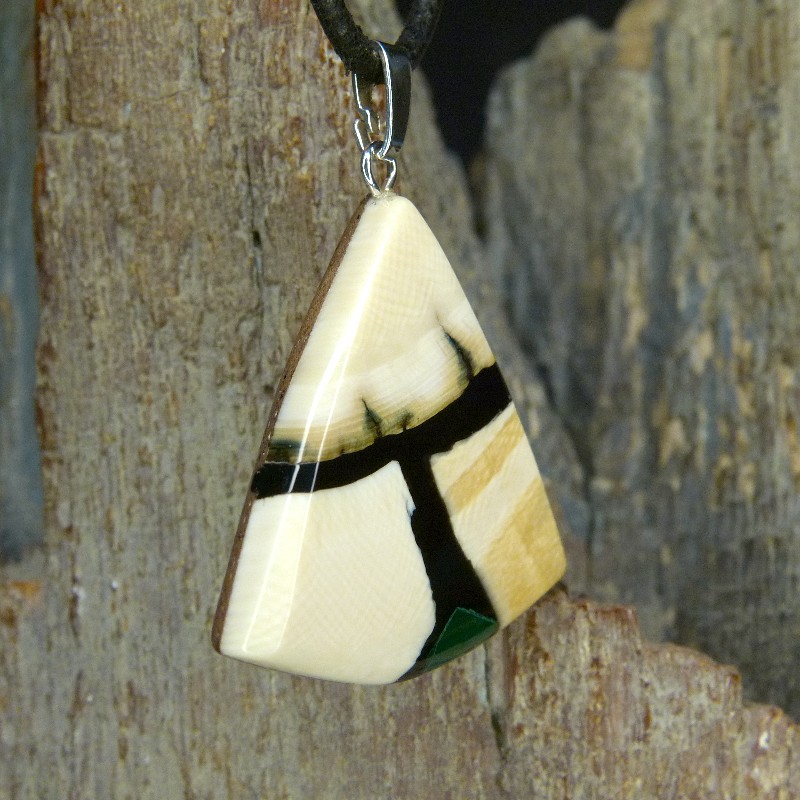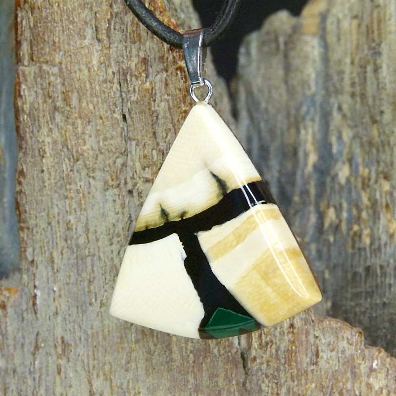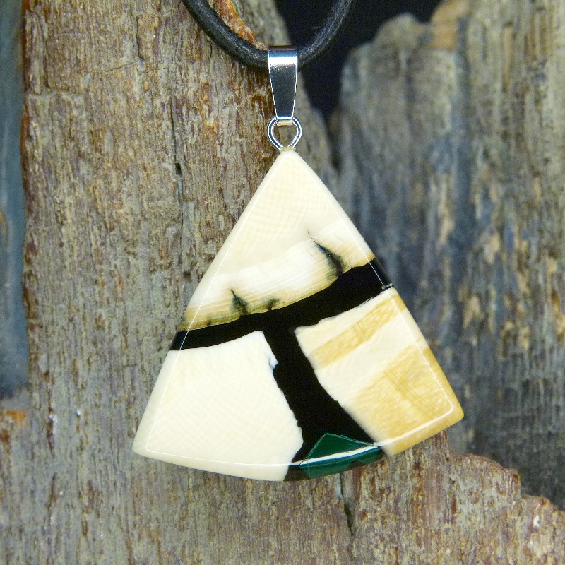Dreieckig geschliffener Anhänger aus cremigem und geflecktem Mammut-Elfenbein mit feiner Maserung. Als Intarsie wurde zusätzlich ein grüner rekonstruierter Malachit eingearbeitet.