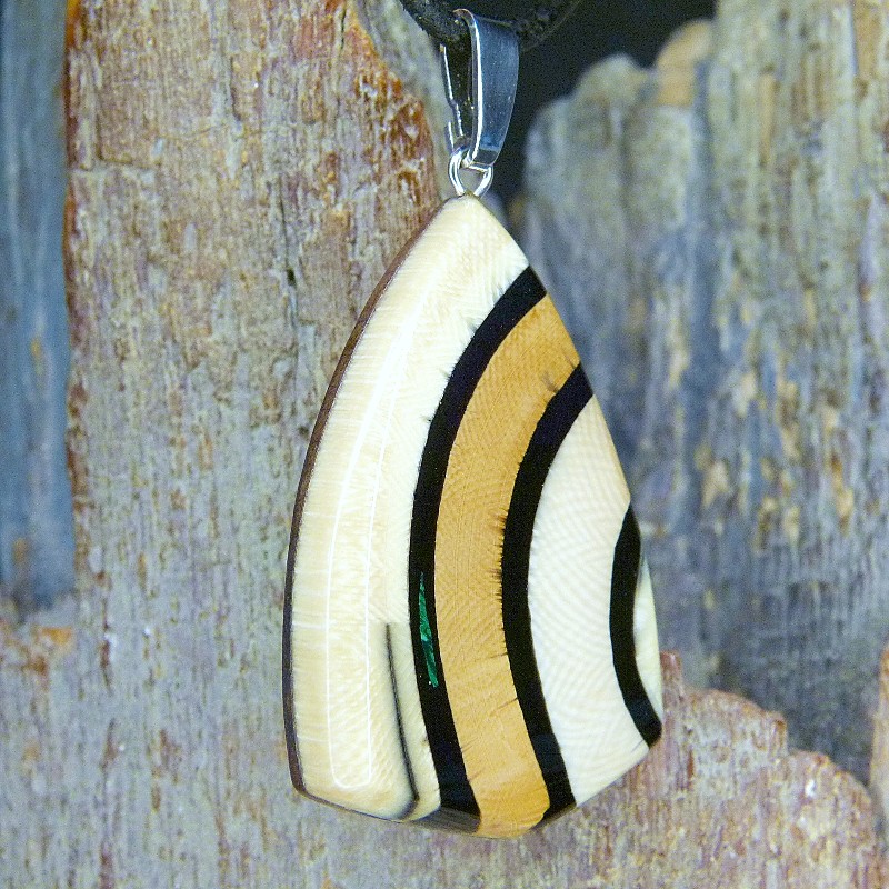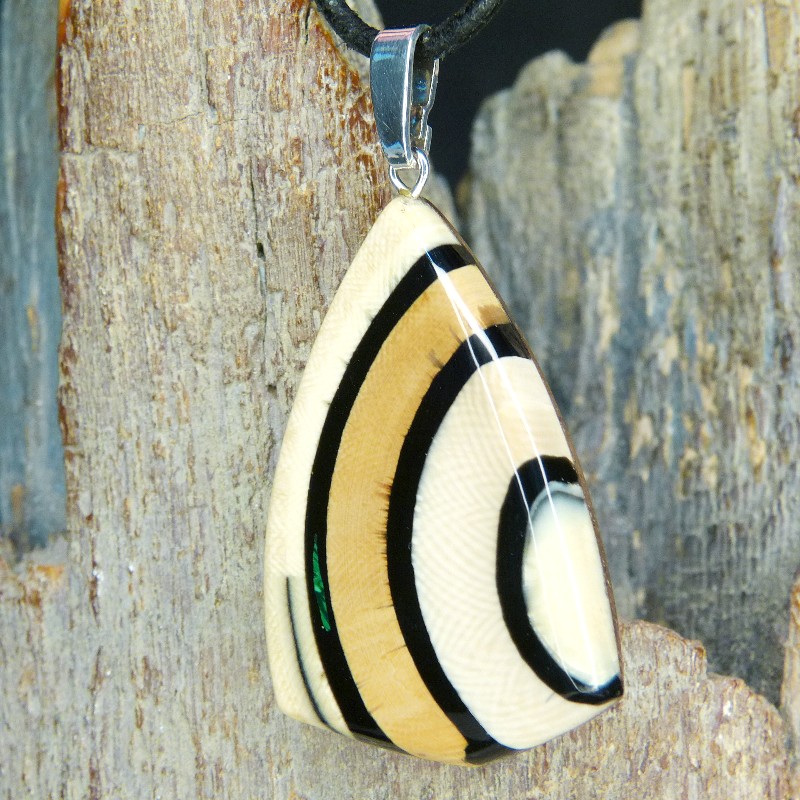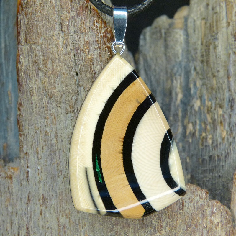 Anhänger aus cremigem und braunem Mammut-Elfenbein mit feiner Maserung. Als Intarsie wurde zusätzlich ein kleiner grüner rekonstruierter Malachit eingearbeitet.