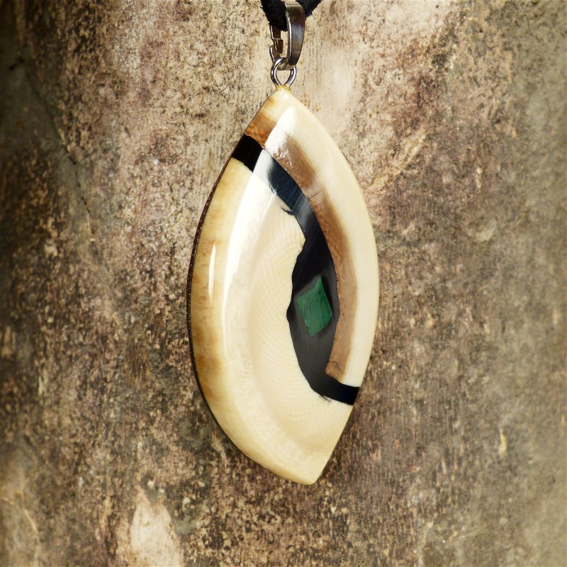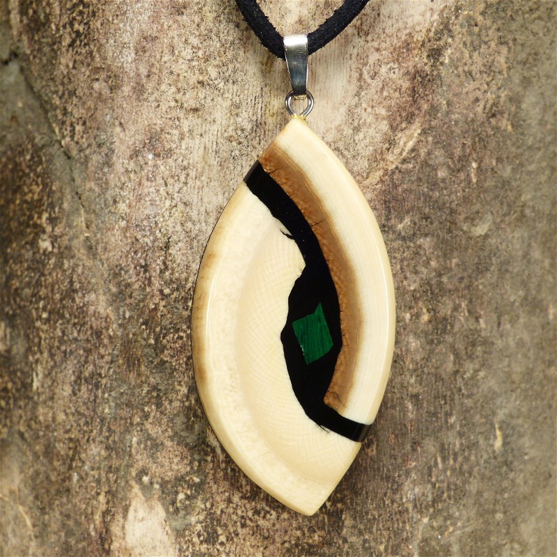 Fein gemaserter Anhänger aus cremefarbenem Mammut-Elfenbein mit brauner Färbung und einer Intarsie aus