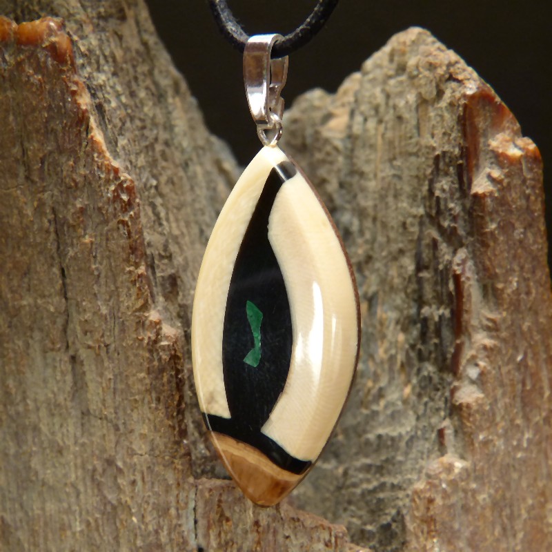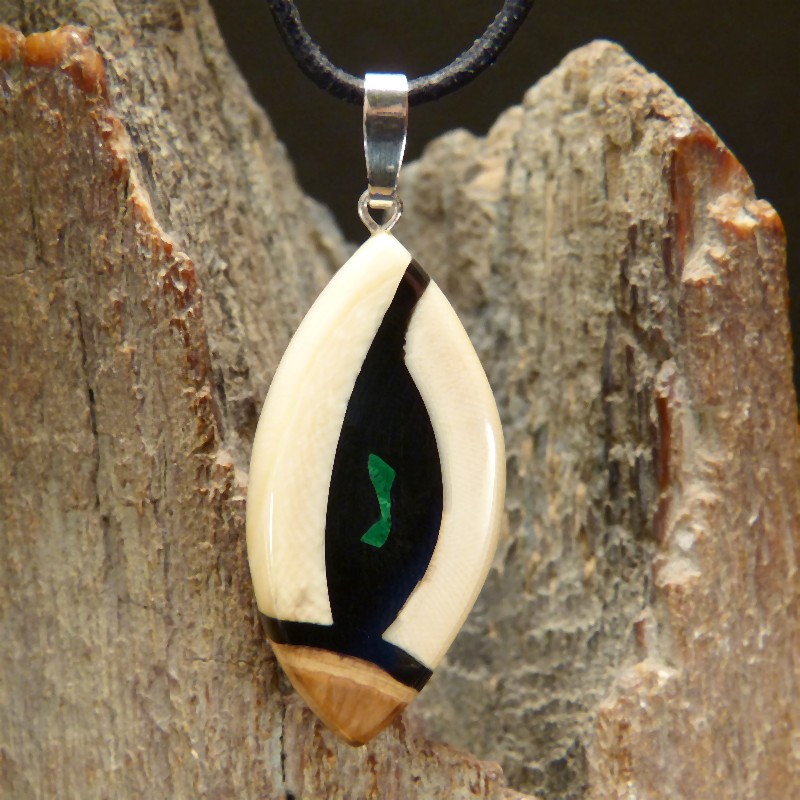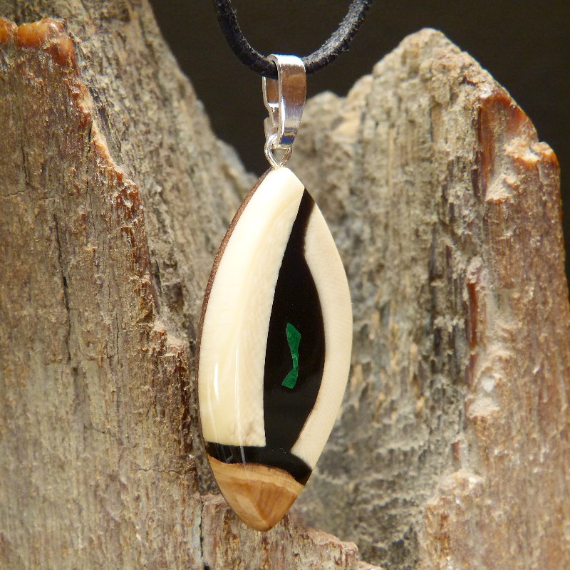 Anhänger aus cremefarbenem und braunem Mammut-Elfenbein mit feiner Maserung und einer zusätzlichen Intarsie aus rekonstruiertem Malachit. Der Anhänger hat eine Größe von ca. 43 x 21 mm (ohne Öse) und wurde zur Stabilisierung mit Nussbaumholz hinterlegt. Die Öse aus 925/-er Silber ist geeignet für Ketten oder Bänder bis zu einer Größe von ca. 3,5 mm. Die Lieferung erfolgt ohne Band, dieses können Sie unter Zubehör separat bestellen.