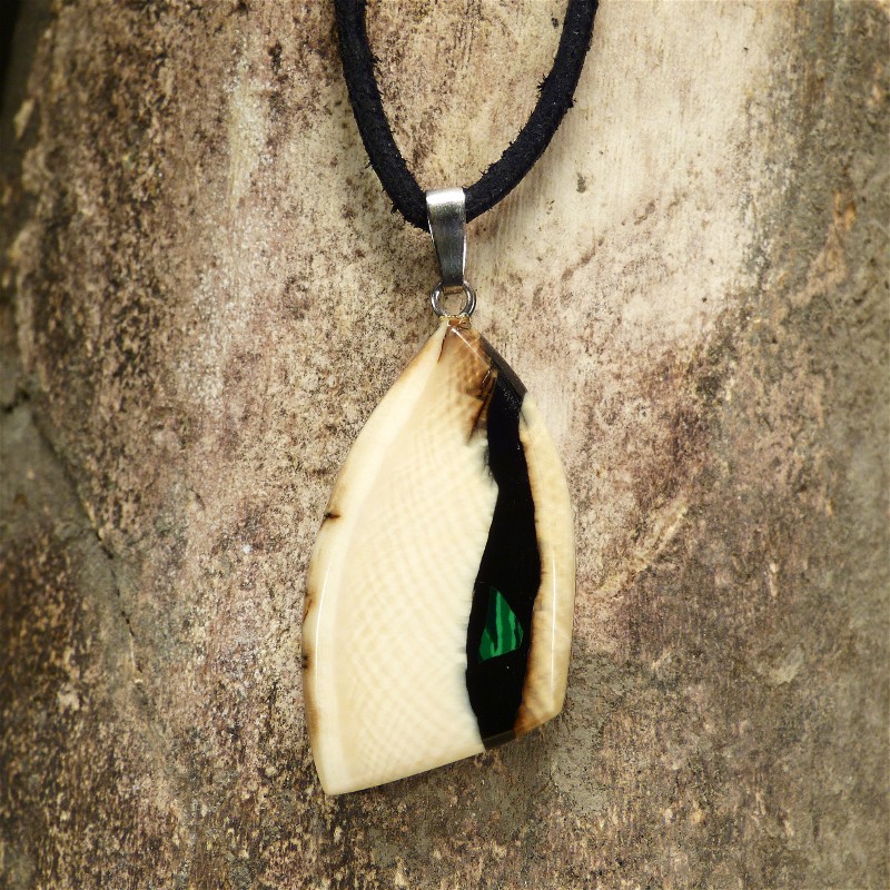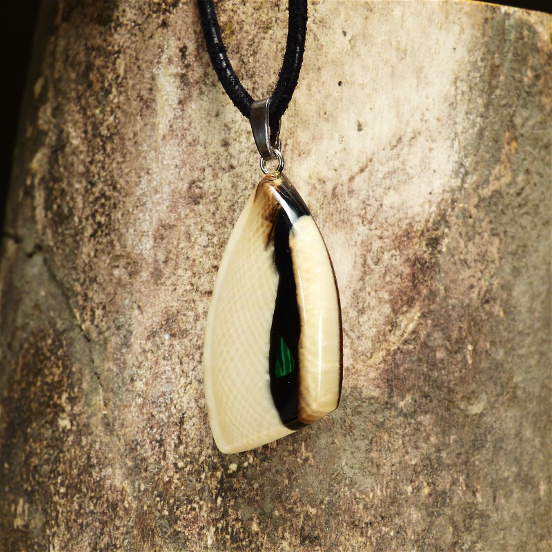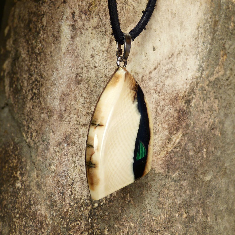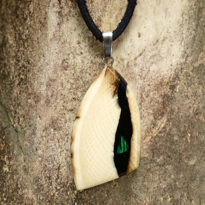 Stark gemaserter Anhänger aus cremefarbenem Mammut-Elfenbein mit brauner Rindefärbung und einer Intarsie aus