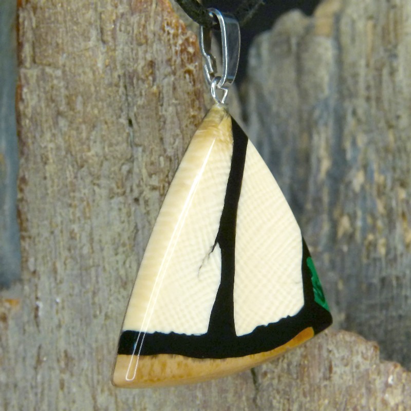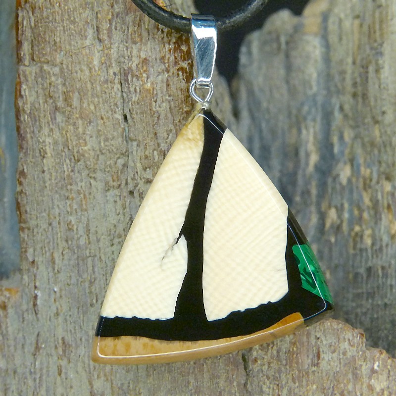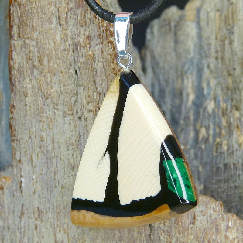 Anhänger aus cremigem und braunem Mammut-Elfenbein mit starker Maserung. Als Intarsie wurde zusätzlich ein grüner rekonstruierter Malachit eingearbeitet.