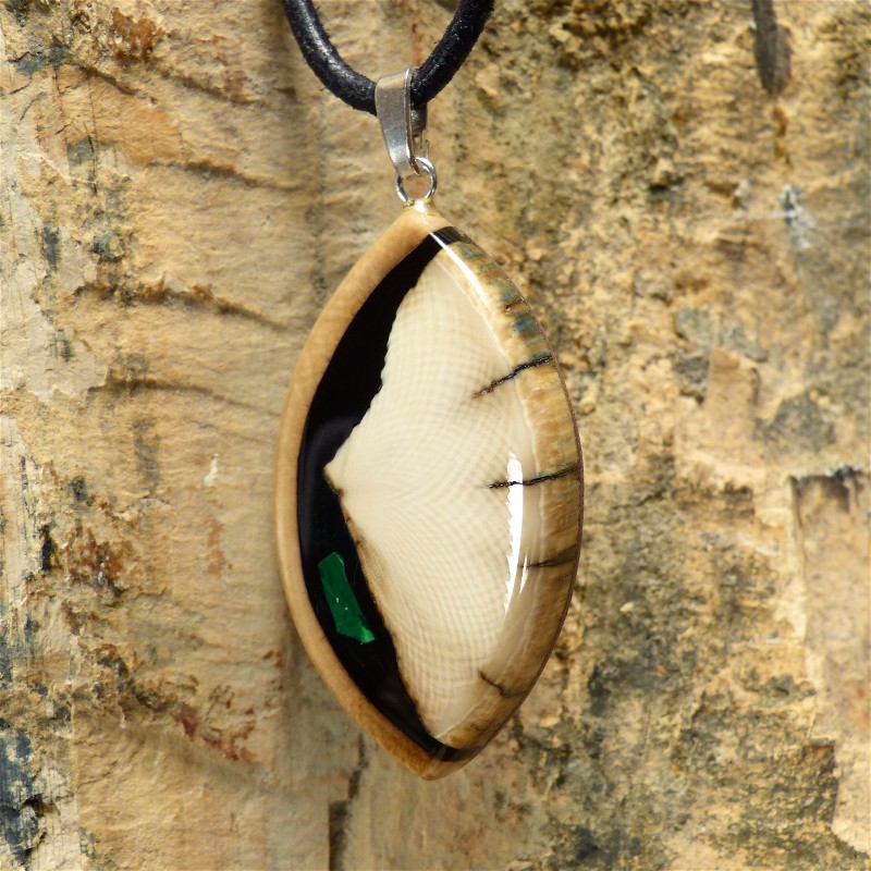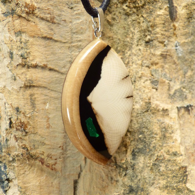 Toll gemaserter Anhänger aus cremefarbenem Mammut-Elfenbein mit braunem Rand und einer Intarsie aus