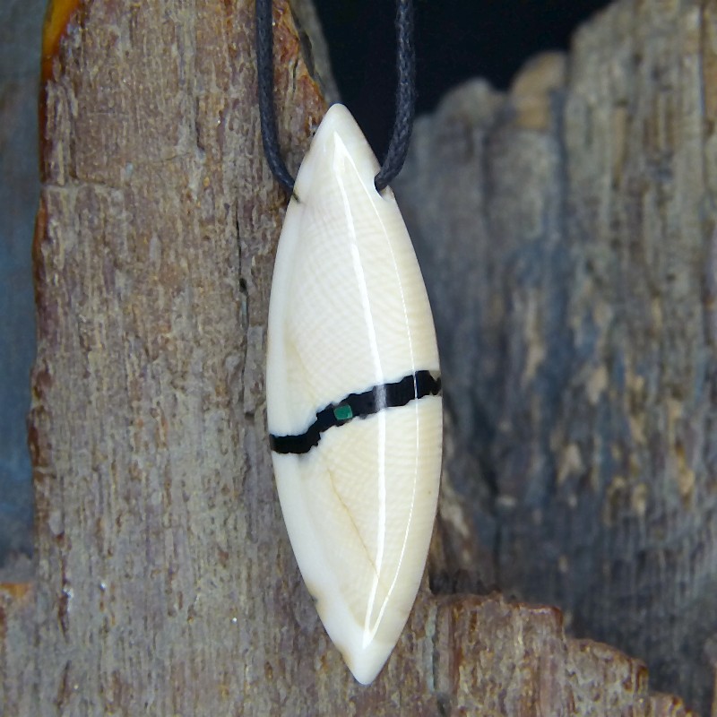 Navetteförmig geschliffener Anhänger aus cremigem Mammut-Elfenbein mit toller Maserung und einer kleinen Intarsie aus grünem Malachit.