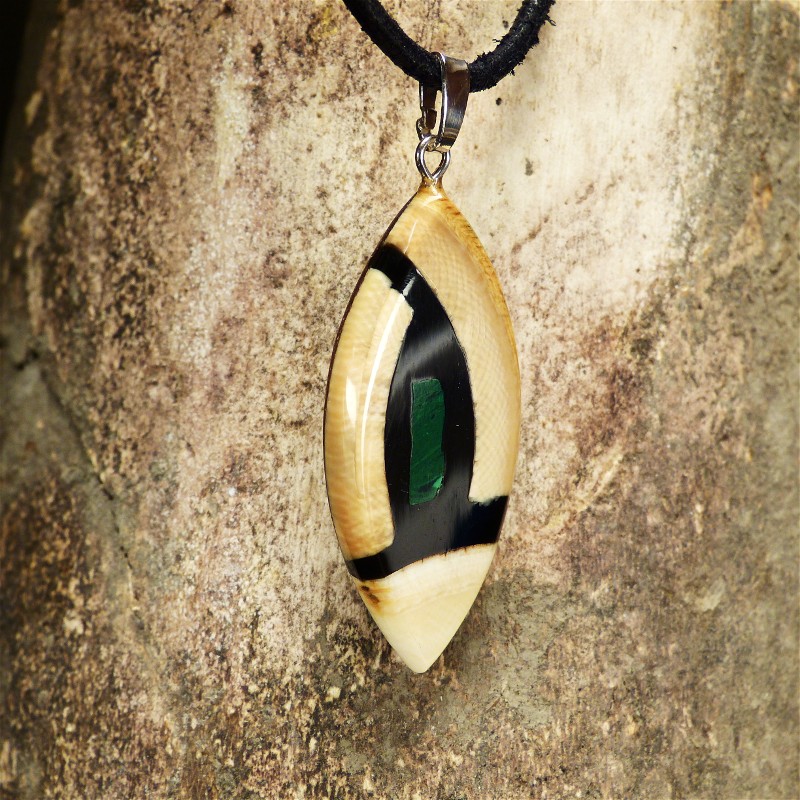 Navetteförmig geschliffener Anhänger aus cremefarbenem und braunem Mammut-Elfenbein mit einer Intarsie aus