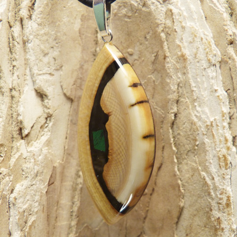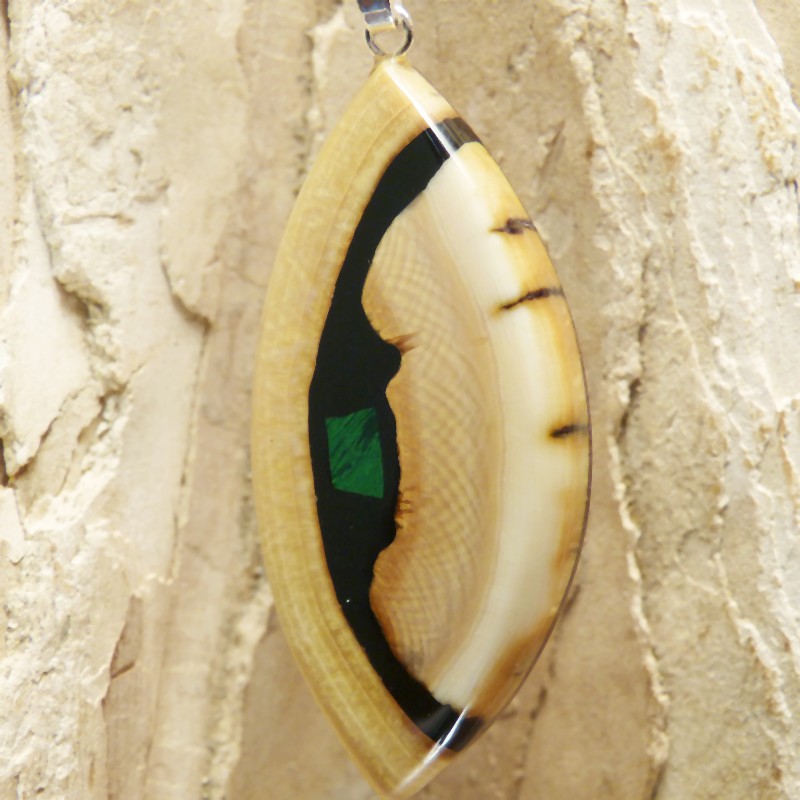 Navetteförmig geschliffener Anhänger aus toll gemasertem, dunkelfarbigem Mammut-Elfenbein mit einem kleinen Malachit, der als Intarsie zusätzlich eingearbeitet wurde. Die Größe des Anhängers beträgt ca. 49 x 24 mm (ohne Öse). Diese ist aus 925/-er Silber gearbeitet und eignet sich für Bänder oder Ketten bis zu einer Stärke von ca. 3,5 mm. Zur Stabilisierung ist die Rückseite mit Nussbaumholz hinterlegt. Die Lieferung erfolgt ohne Band, dieses können Sie unter Zubehör separat bestellen.