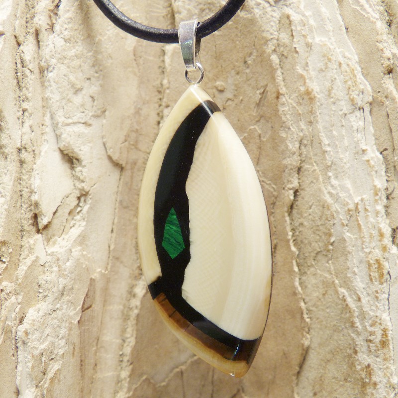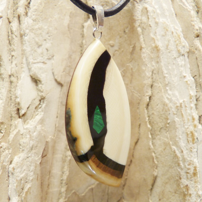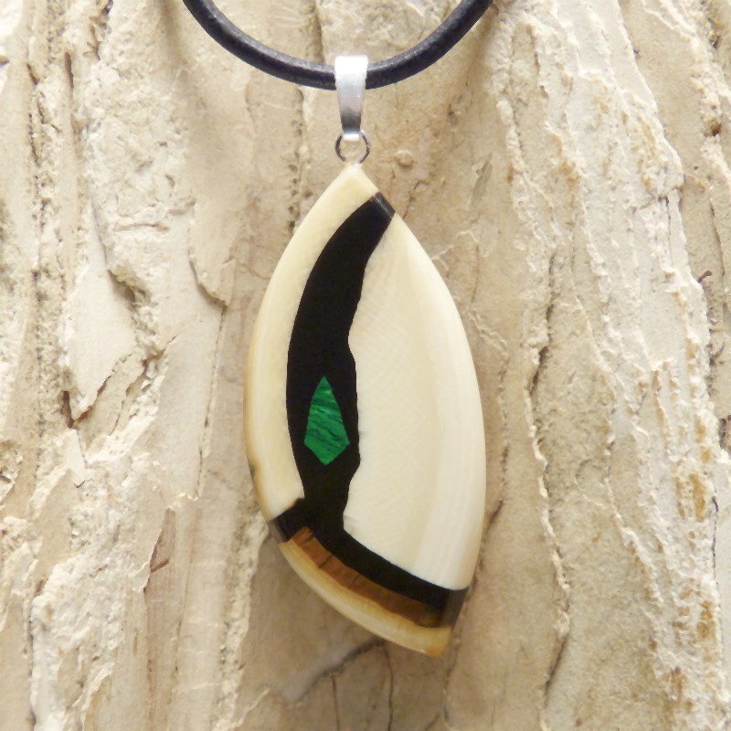Mammut-Elfenbein mit brauner Ecke. Zusätzlich wurde als Intarsie ein kleiner rekonstruierter Malachit eingearbeitet. Die Größe