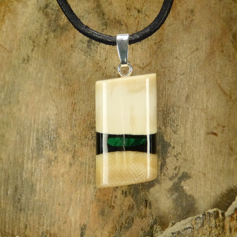 Trapezförmiger Anhänger aus cremefarbenem Mammut-Elfenbein mit einer zusätzlichen Intarsie aus rekonstruiertem Malachit. Der Anhänger hat eine Größe von ca. 27 x 15 mm (ohne Öse) und wurde zur Stabilisierung mit Nussbaumholz hinterlegt. Die Öse aus 925/-er Silber ist geeignet für Ketten oder Bänder bis zu einer Größe von ca. 2,5 mm. Die Lieferung erfolgt ohne Band, dieses können Sie unter Zubehör separat bestellen.