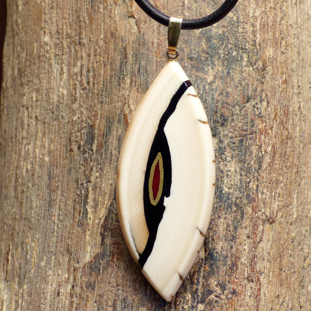 Großer navetteförmiger Anhänger aus cremefarbenem Mammut mit schöner Maserung und interessanter Außenrinde. Mittig wurde ein dunkelroter
