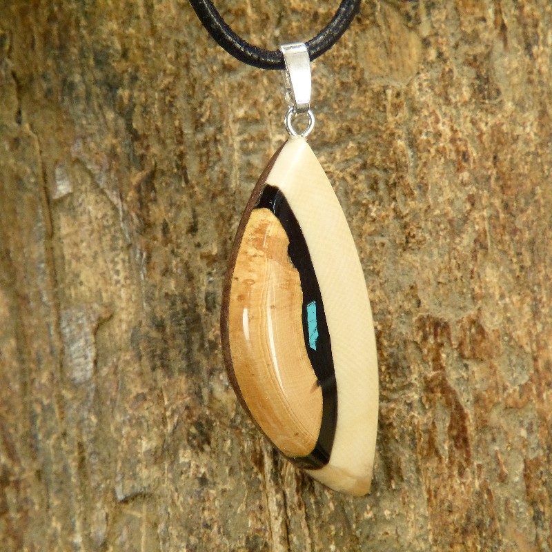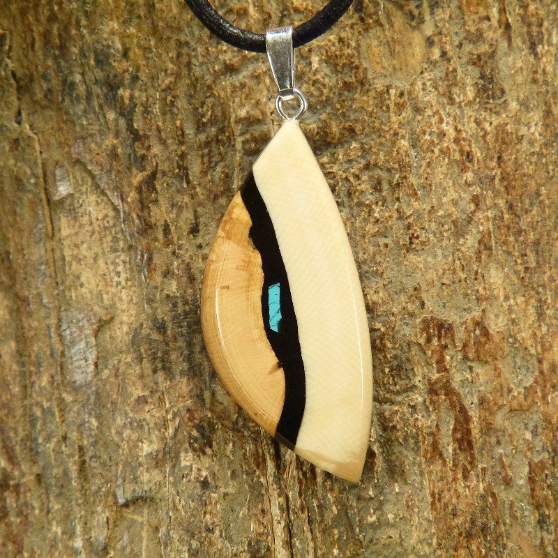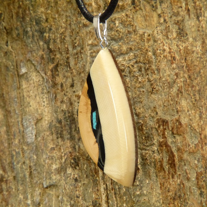 Anhänger aus braunem und cremefarbenem Mammut-Elfenbein mit feiner Maserung. Zusätzlich ist ein rekonstruierter Türkis als Intarsie eingearbeitet, die Rückseite zur Stabilisierung mit Nussbaumholz hinterlegt. Der Anhänger hat ohne Öse eine Größe von ca. 40 x 18 mm. Die Öse aus 925/-er Silber ist geeignet für Ketten oder Bänder bis zu einer Stärke von ca. 3 mm. Die Lieferung erfolgt ohne Band, dieses können Sie unter Zubehör separat bestellen.