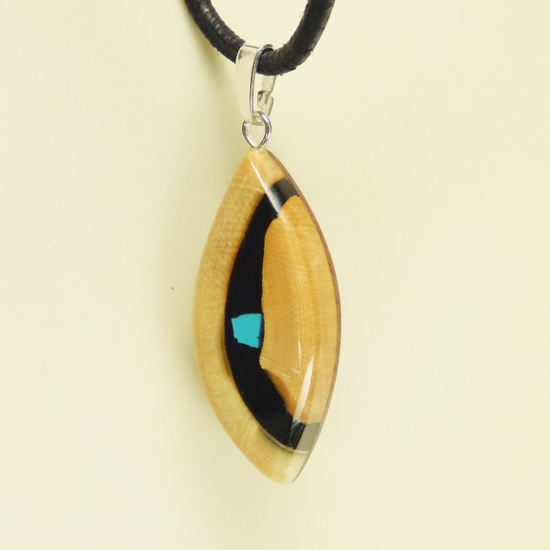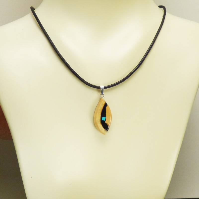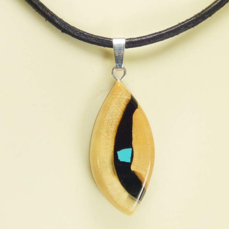 Navetteförmig geschliffener Anhänger aus bräunlichem Mammut-Elfenbein mit feiner Maserung und mittig eingearbeitetem rekonstruiertem Türkis.