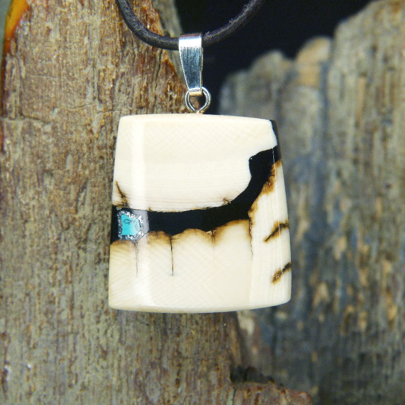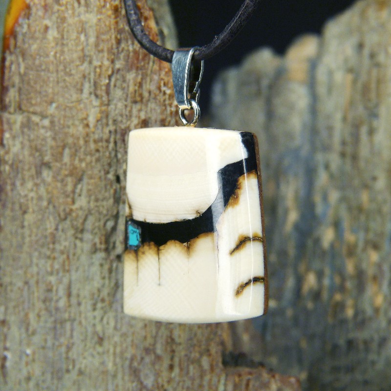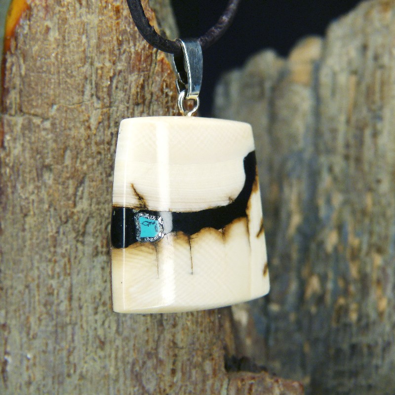 Kantig geschliffener Anhänger aus hellem Mammut-Elfenbein mit braunen Färbungen und einer Intarsie aus rekonstruiertem Türkis.