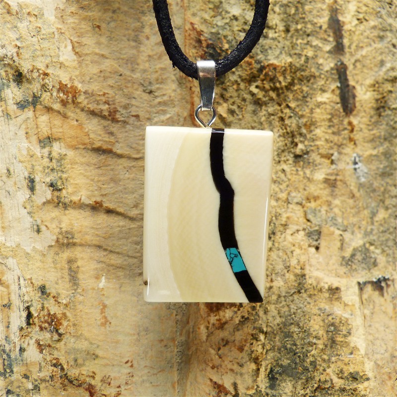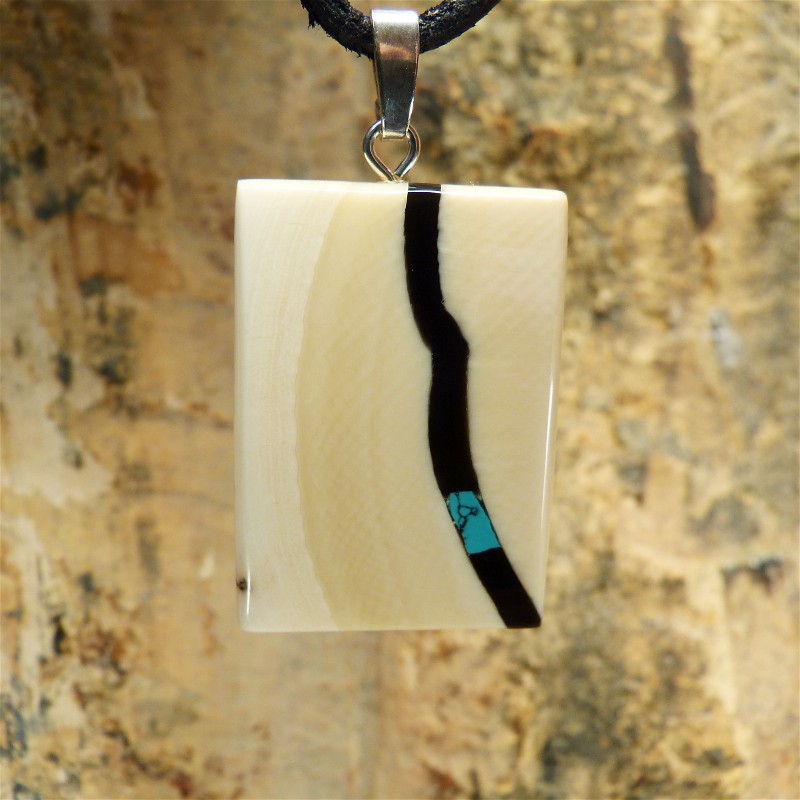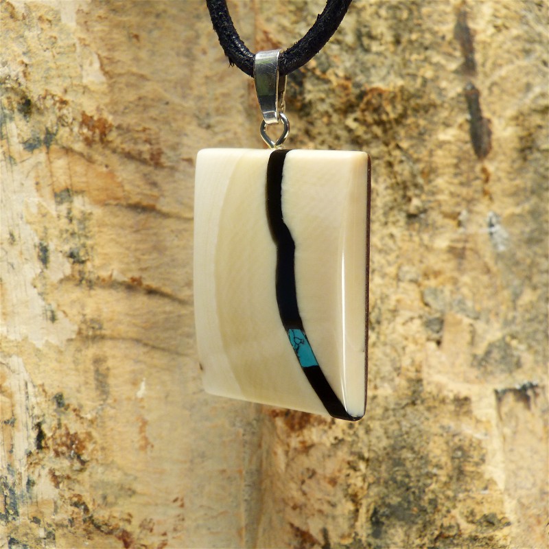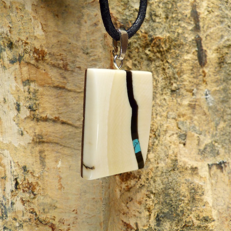 Kantig geschliffener Anhänger aus hellem Mammut-Elfenbein mit breitem Zahnschmelz und einer Intarsie aus
