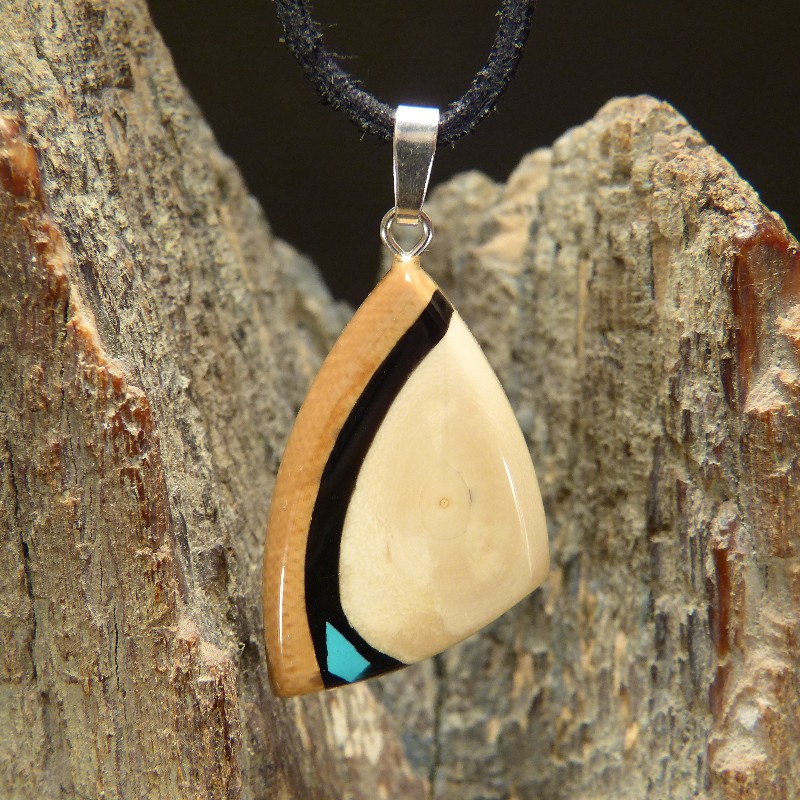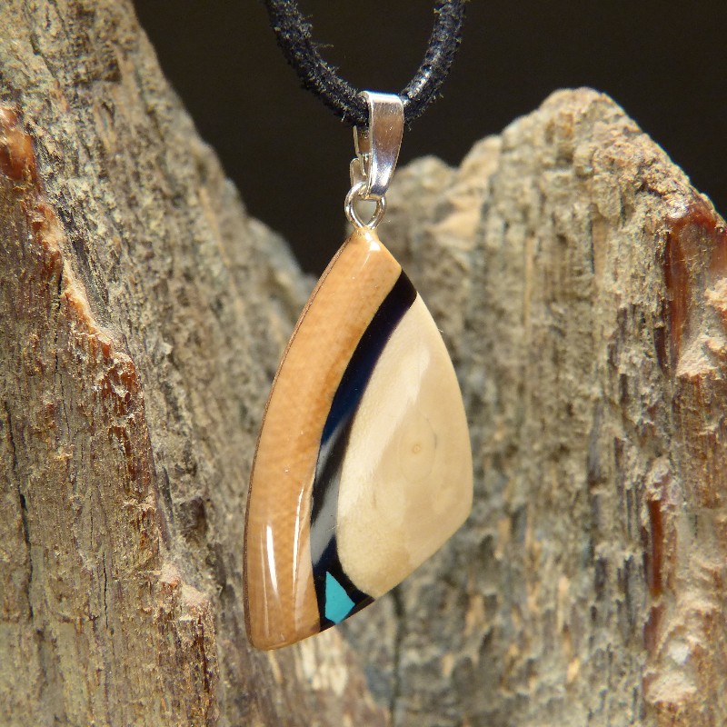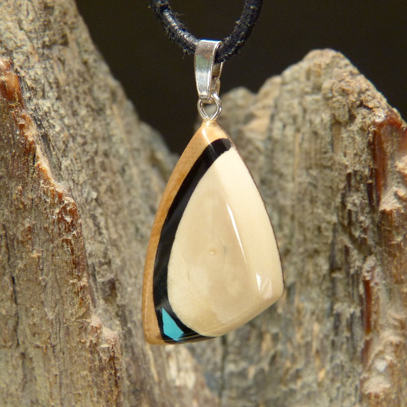 Anhänger aus cremefarbenem und braunem Mammut-Elfenbein mit einer Intarsie aus rekonstruiertem Türkis. Der Anhänger hat eine Größe von ca. 32 x 20 mm (ohne Öse) und wurde zur Stabilisierung mit Nussbaumholz hinterlegt. Die Öse aus 925/-er Silber ist geeignet für Ketten oder Bänder bis zu einer Größe von ca. 3 mm. Die Lieferung erfolgt ohne Band, dieses können Sie unter Zubehör separat bestellen.