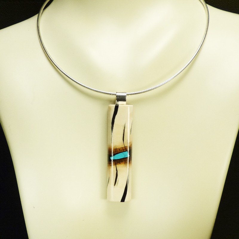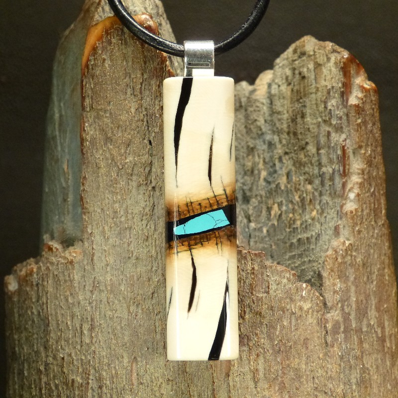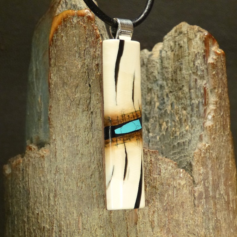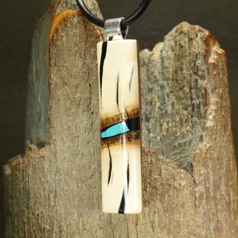 Länglicher Stab-Anhänger aus cremefarbenem Mammut-Elfenbein mit schönen Färbungen und einer Intarsie aus rekonstruiertem Türkis.