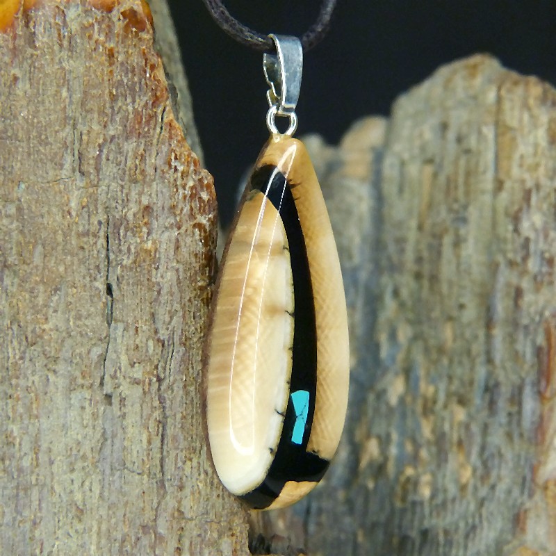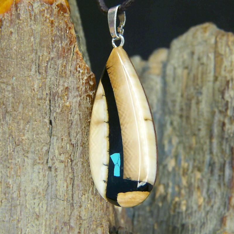 Tropfenanhänger aus dunklem Mammut-Elfenbein mit schöner Maserung und einer Intarsie aus rekonstruiertem Türkis.