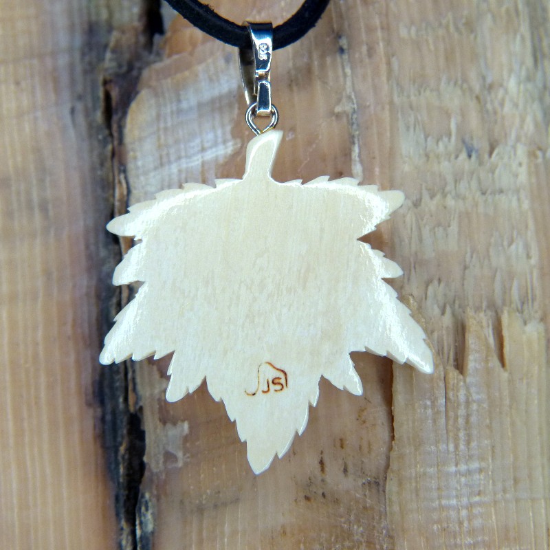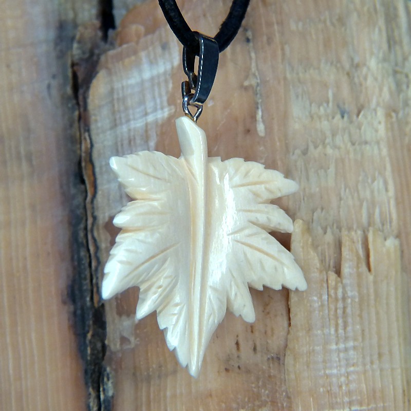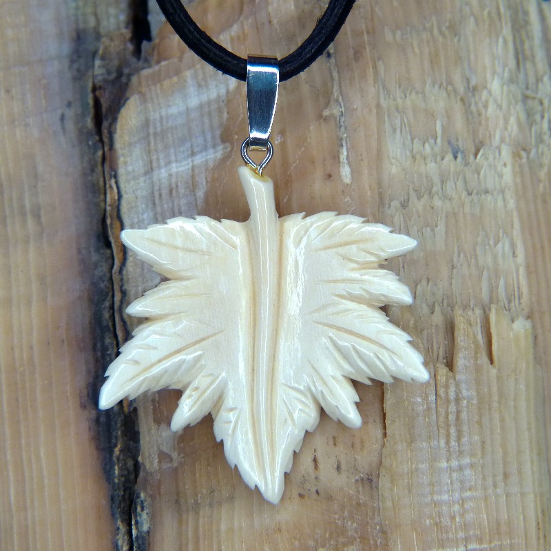 Ahornblatt als Anhänger aus hellem Mammut-Elfenbein geschnitzt. Es hat eine Größe von ca. 38 x 36mm und ist mit einer Öse aus 925/-er Silber versehen.