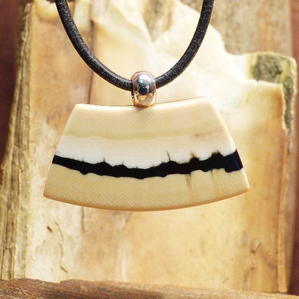 Schön gemaserter Anhänger aus cremigem Mammut-Elfenbein, quer gearbeitet. Die fest montierte Silberöse eignet sich für Bänder, Ketten oder Reifen bis zu einem Durchmesser von ca. 4,5 mm. Der Anhänger hat mit Öse eine Größe von ca. 37 x 54 mm. Die Lieferung erfolgt ohne Band, dieses können Sie unter Zubehör separat bestellen.
