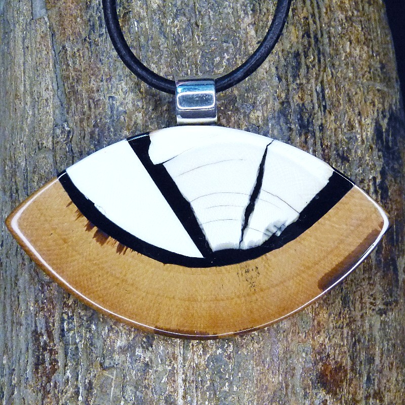 Großer, auffälliger Queranhänger aus hellem und dunkelbraunem Mammut-Elfenbein mit feiner Maserung. Er hat eine Größe von ca. 85 x 47 mm und ist auf der Rückseite zur Stabilisierung mit Nussbaumholz hinterlegt.