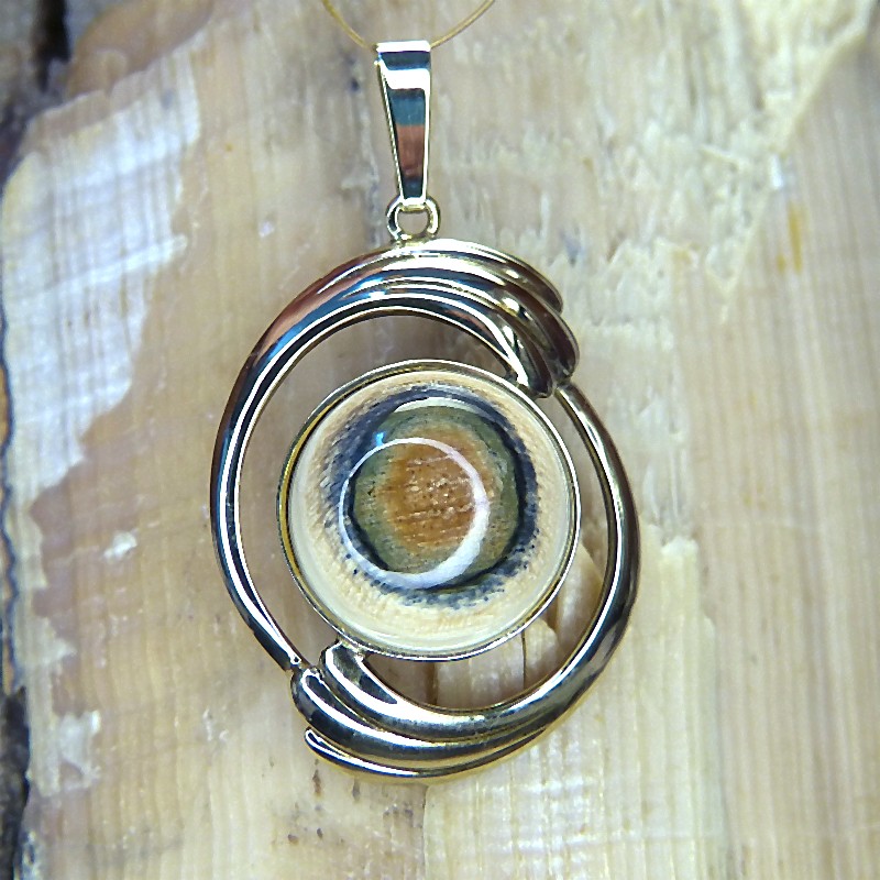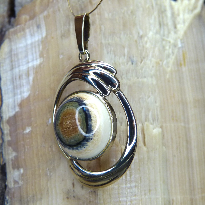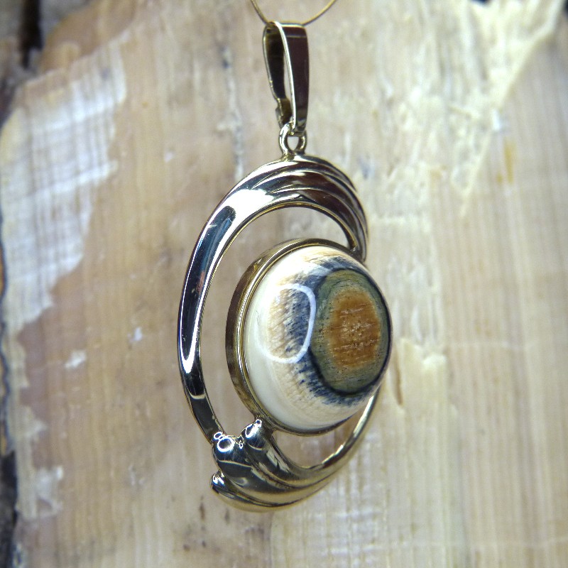 Anhänger aus 333/- Gelbgold, kombiniert mit einem ca. 18mm großen Cabochon aus cremigem Mammutelfenbein mit toller Rindenfärbung.