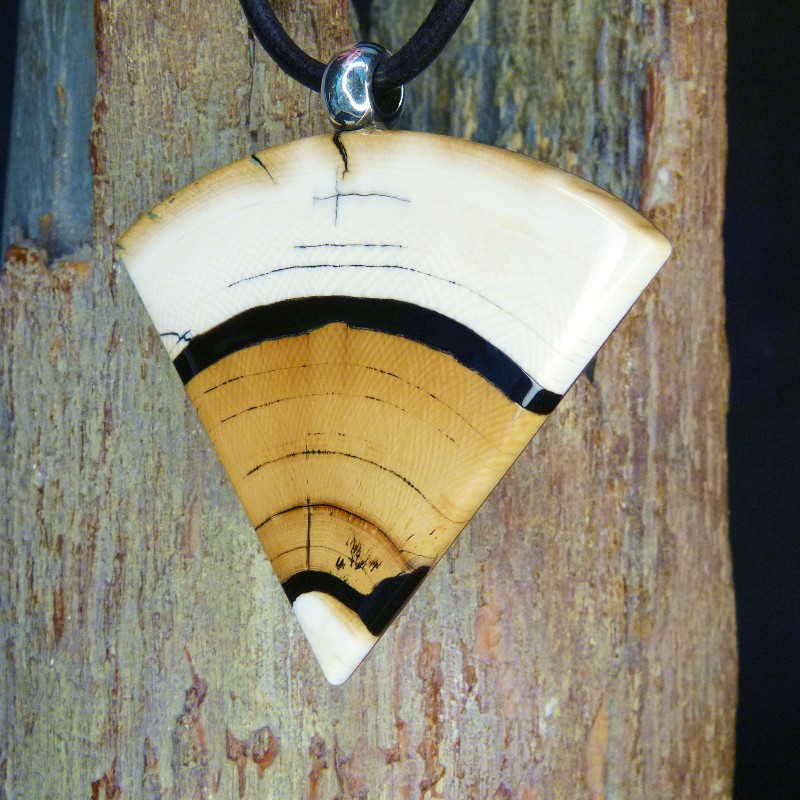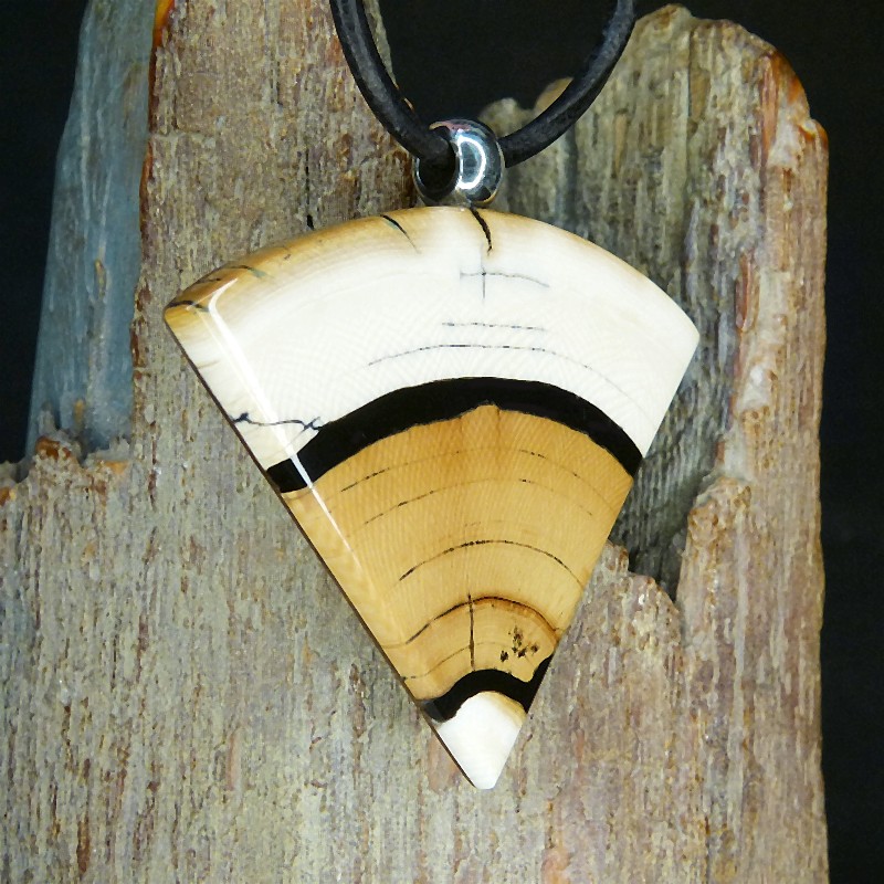Dreieckanhänger aus cremigem und braunem Mammut-Elfenbein mit ausgeprägter Maserung und schöner Rindenfärbung. Er hat eine Größe von ca. 67 x 57 mm und ist auf der Rückseite zur Stabilisierung mit Nussbaumholz hinterlegt. Die große massive und fest montierte Öse aus 925/-er Silber eignet sich für Bänder oder Reifen bis zu einem Durchmesser von ca. 5 mm. Passende Bänder finden Sie unter Zubehör.