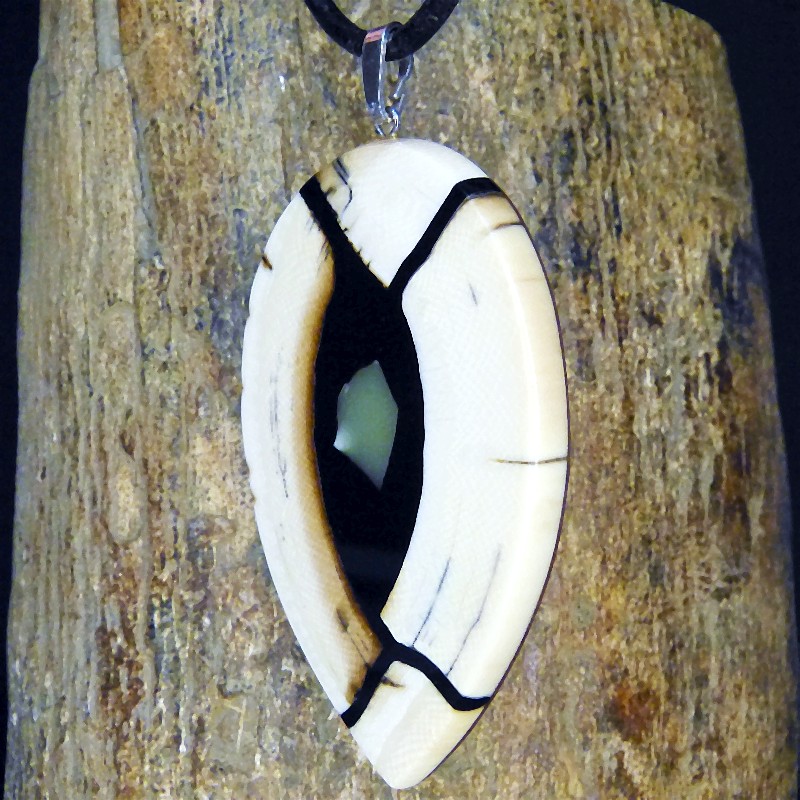 Großer, auffälliger Anhängerr aus fossilem Mammut-Elfenbein mit feiner Maserung und schönen Färbungen sowie einer Intarsie aus rekonstruierter Jade.