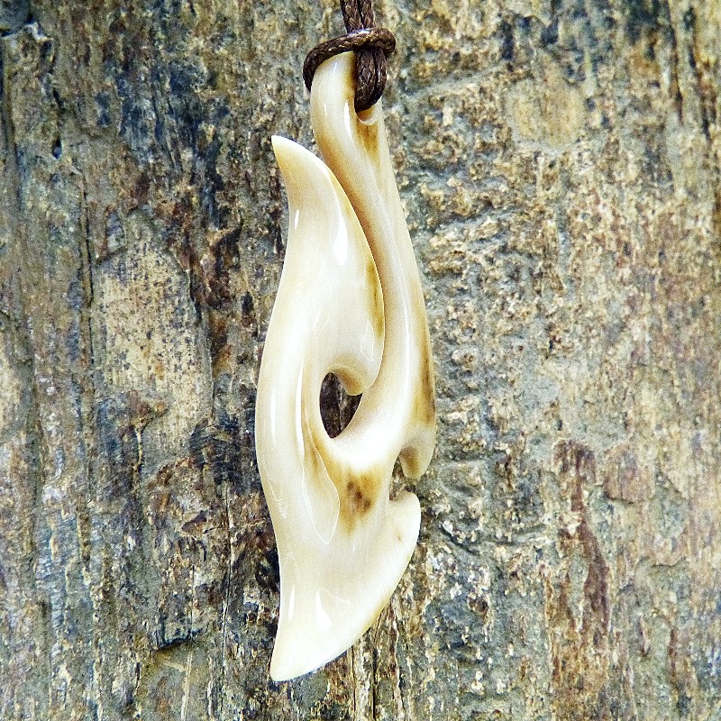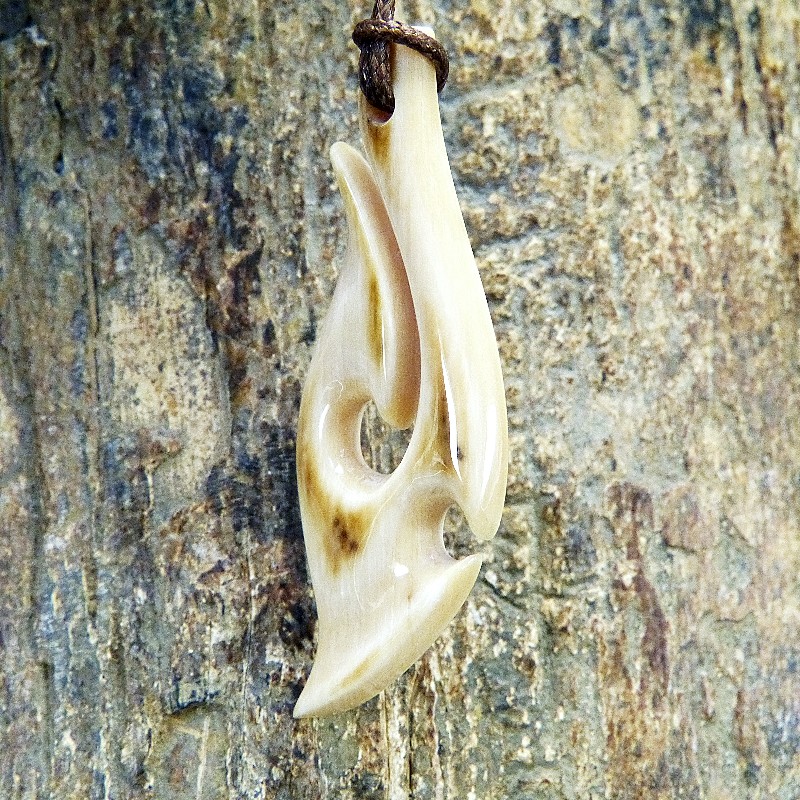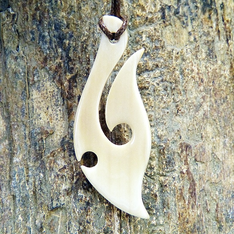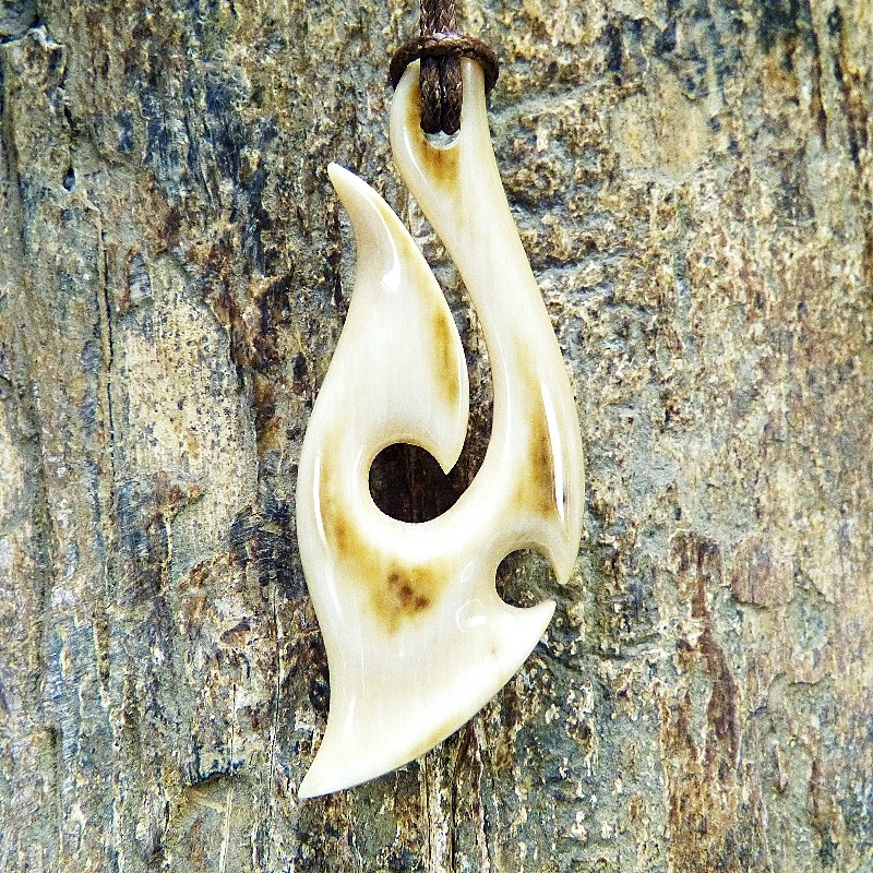 Stilisierter Angelhaken als Anhänger, wie ihn die Ureinwohner Neuseelands tragen, gefertigt aus cremefarbenem Mammut-Elfenbein mit bräunlicher Rindenfärbung.