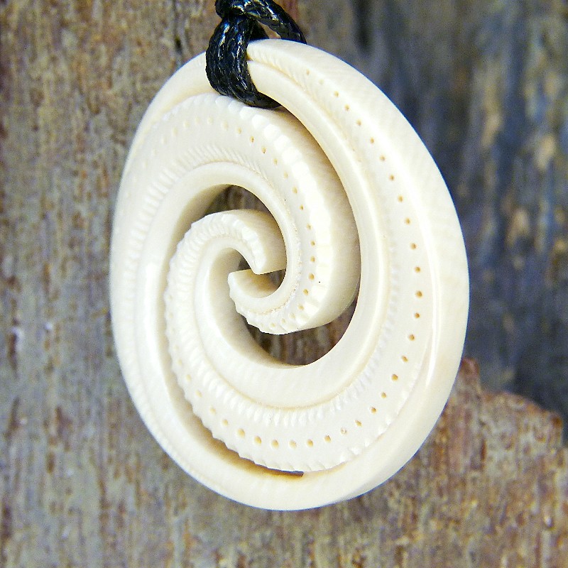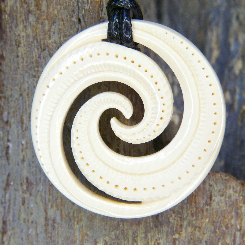 Hei Matau als Doppelspirale, gefertigt aus hellem fossilem Mammut-Elfenbein mit feiner Verzierung.