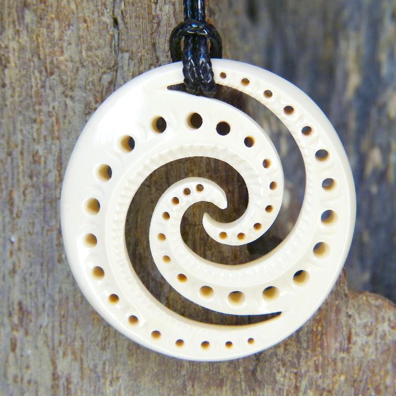 Hei Matau als Doppelspirale, gefertigt aus hellem fossilem Mammut-Elfenbein mit schöner Lochverzierung.