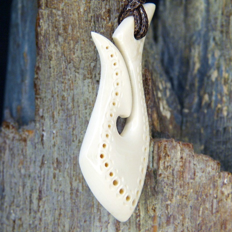 Stilisierter Angelhaken als Anhänger, wie ihn die Ureinwohner Neuseelands tragen, gefertigt aus cremefarbenem Mammut-Elfenbein mit schöner Lochverzierung.
