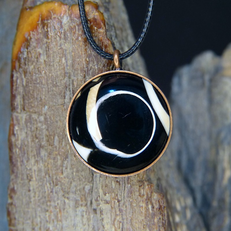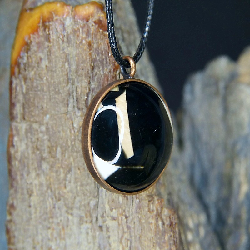 Runder Anhänger aus Kupfer im Antikfinish und einer Einlage aus Mammut-Mosaik.