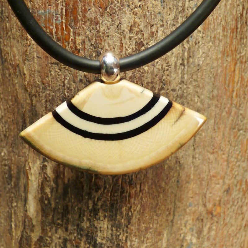 Toll gemaserter und gefärbter Anhänger aus fossilem Mammut-Elfenbein mit schöner Außenrinde. Er hat eine Größe von ca. 6 x 3,1 cm und ist auf der Rückseite zur Stabilisierung mit Nussbaumholz hinterlegt. Die fest montierte Öse aus 925/-er Silber eigent sich für Bänder bis zu ca. 4 mm. Das beiliegende Kautschukband misst ca. 4 mm bei einer Länge von ca. 50 cm und wird durch einen einfachen Steckverschluss gehalten. Die Länge können Sie einfach mittels einer Schere kürzen.