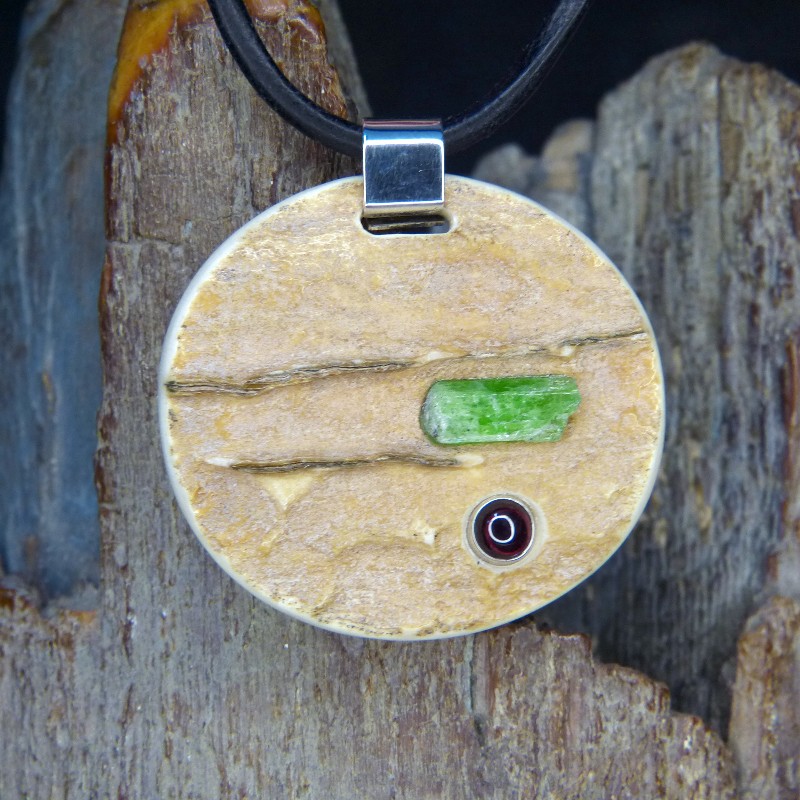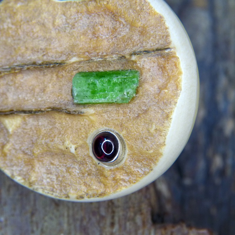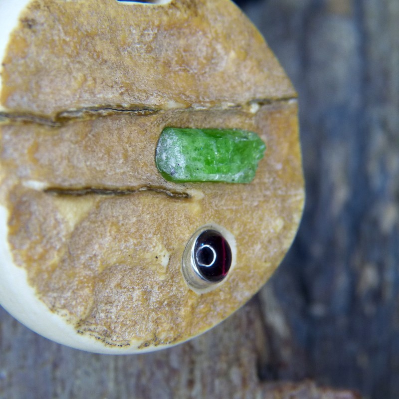 Zusätzlich wurde ein grüner Diopsid sowie ein dunklerroter, in Silber gefasster Granat eingearbeitet.
