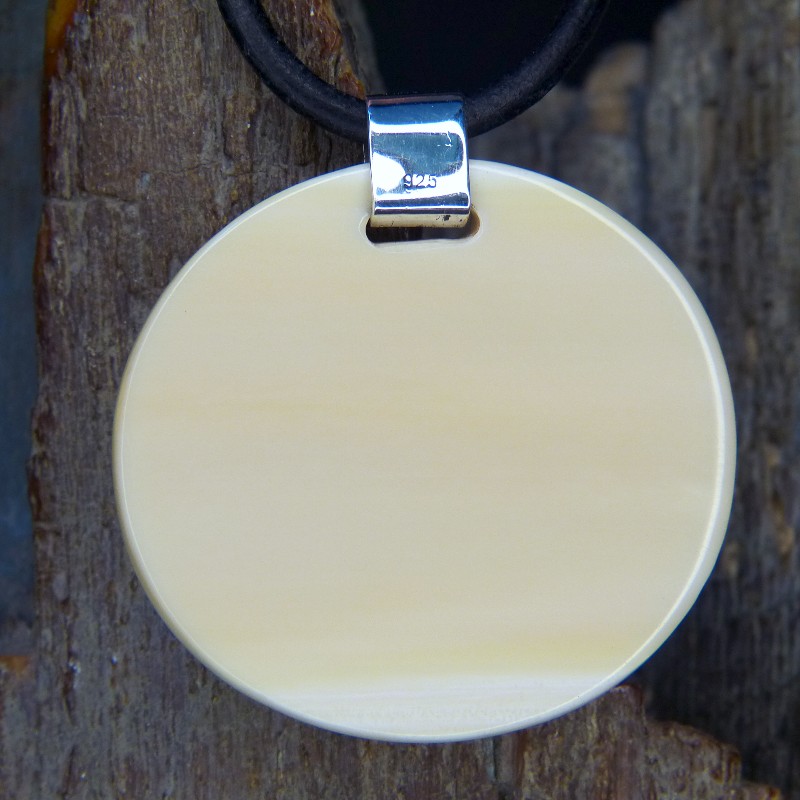 Von Hand geschliffener Scheibenanhänger aus Mammut-Elfenbein mit außergewöhnlicher Rindenstruktur und bräunlicher Färbung.