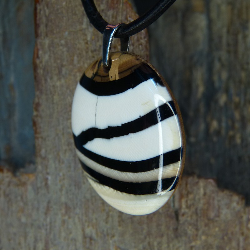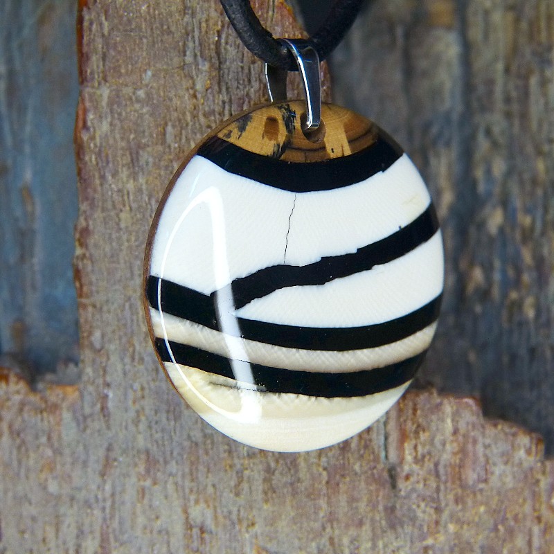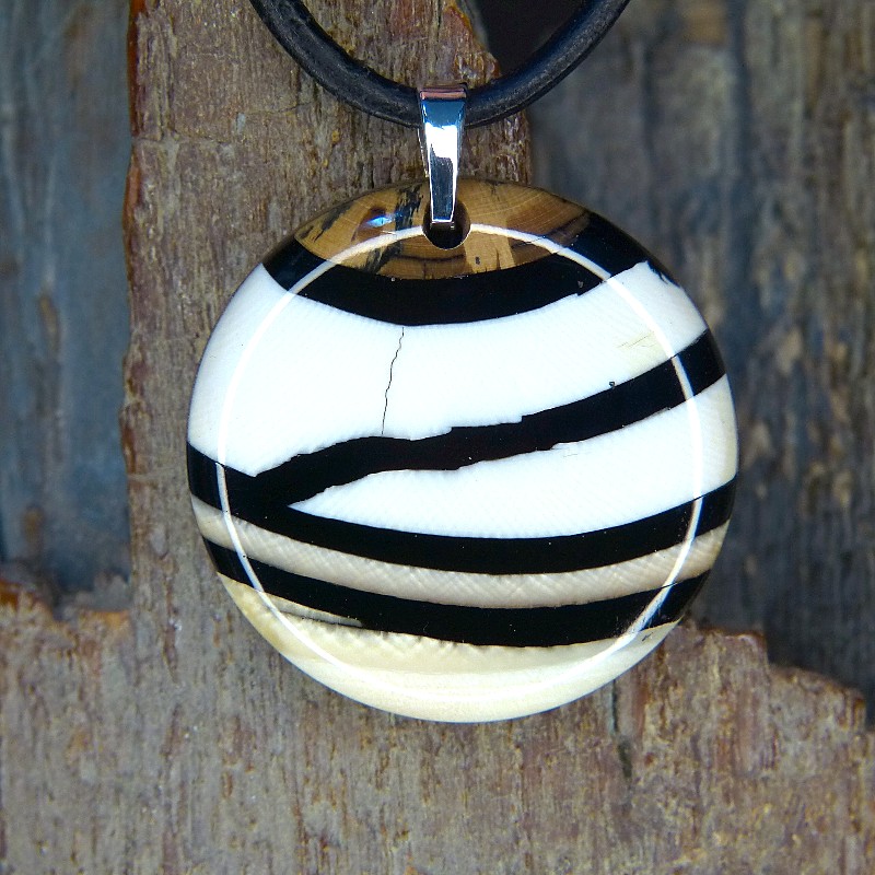 Scheiben-Anhänger aus cremefarbenem und braunem Mammut-Elfenbein in Streifenoptik.