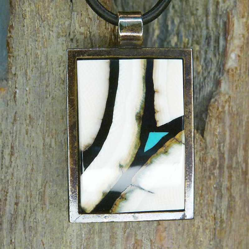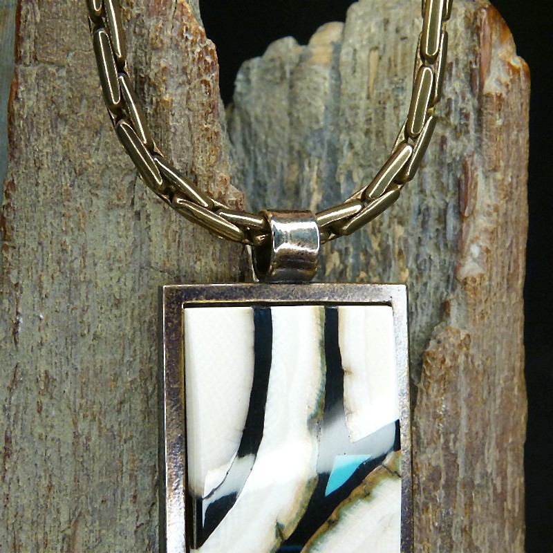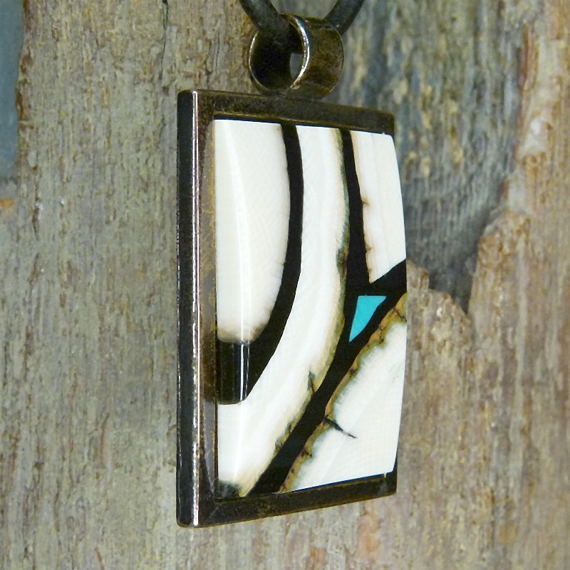 Ausgefallener Anhänger aus cremefarbenem Mammut-Elfenbein mit schönen Naturfärbungen und einer Intarsie aus Türkis. Das Mammut ist in einen aus massiver Bronze gegossenen Rahmen eingearbeitet, der durch sein antikes Finish sehr schön zu den Färbungen des Materials passt.