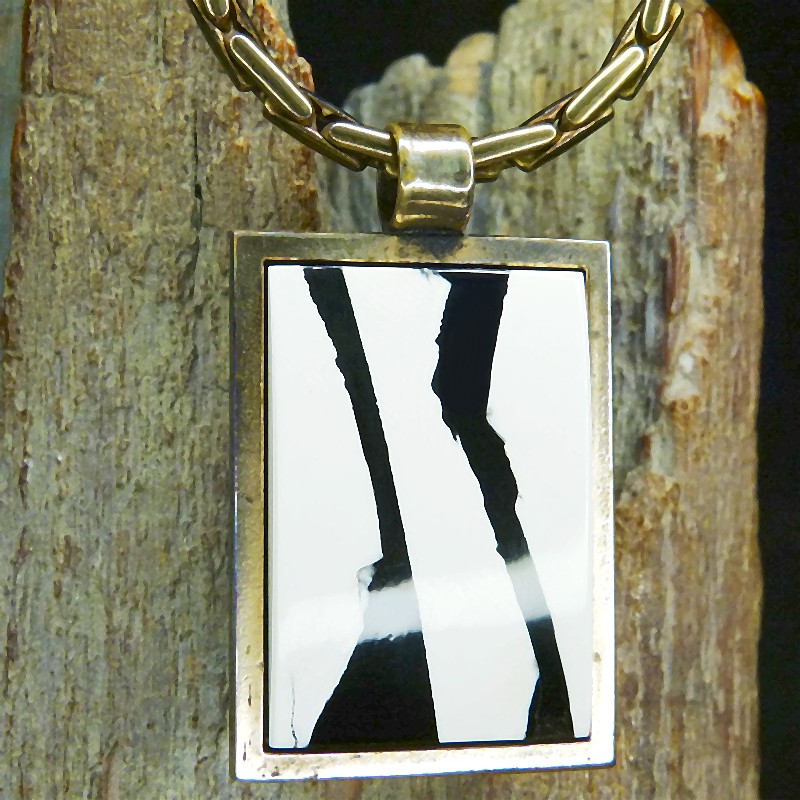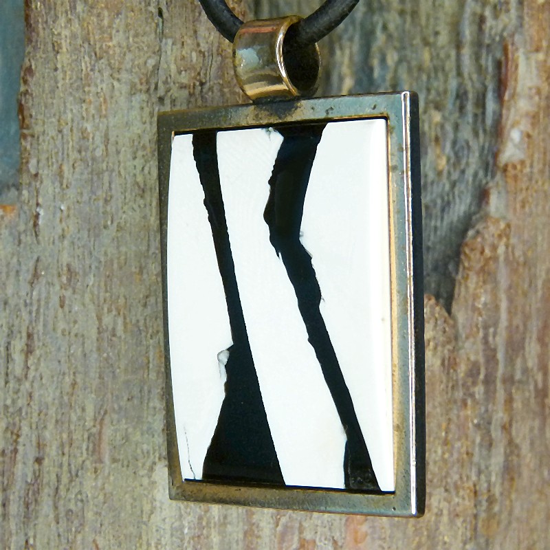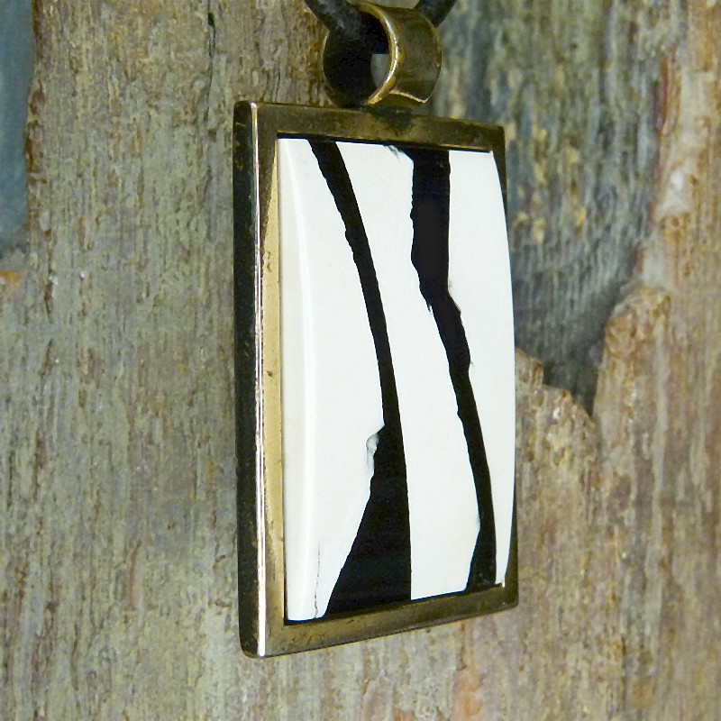 Ausgefallener Anhänger aus hellem Mammut-Elfenbein mit feiner Maserung. Das Mammut ist in einen aus massiver Bronze gegossenen Rahmen eingearbeitet, der durch sein antikes Finish sehr schön zu den Färbungen des Materials passt.