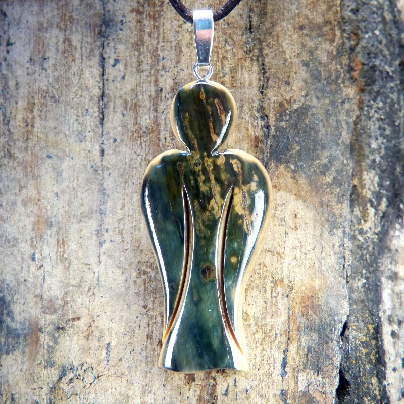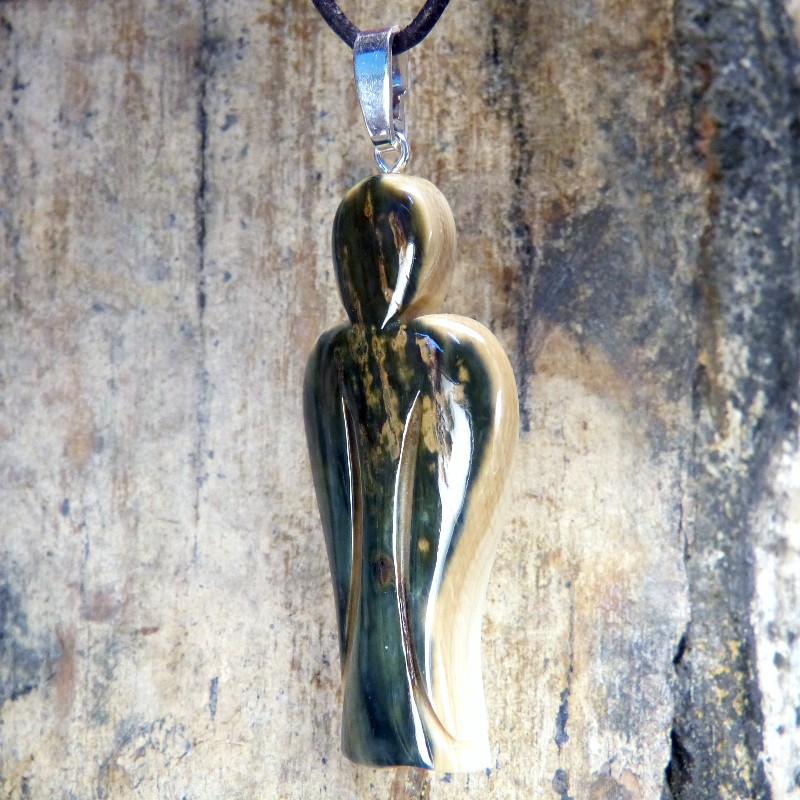 Ca. 52 mm großer moderner Schutzengel aus fossilem Mammut-Elfenbein mit seltener und intensiver grünlich/blauer Rindenfärbung.