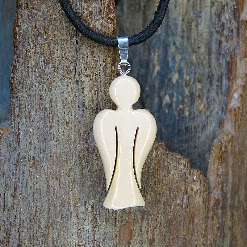 Moderner Schutzengel aus Mammut-Elfenbein mit feiner Maserung. Er hat eine Größe von ca. 36 x 17 mm bei einer Stärke von ca. 5 mm.