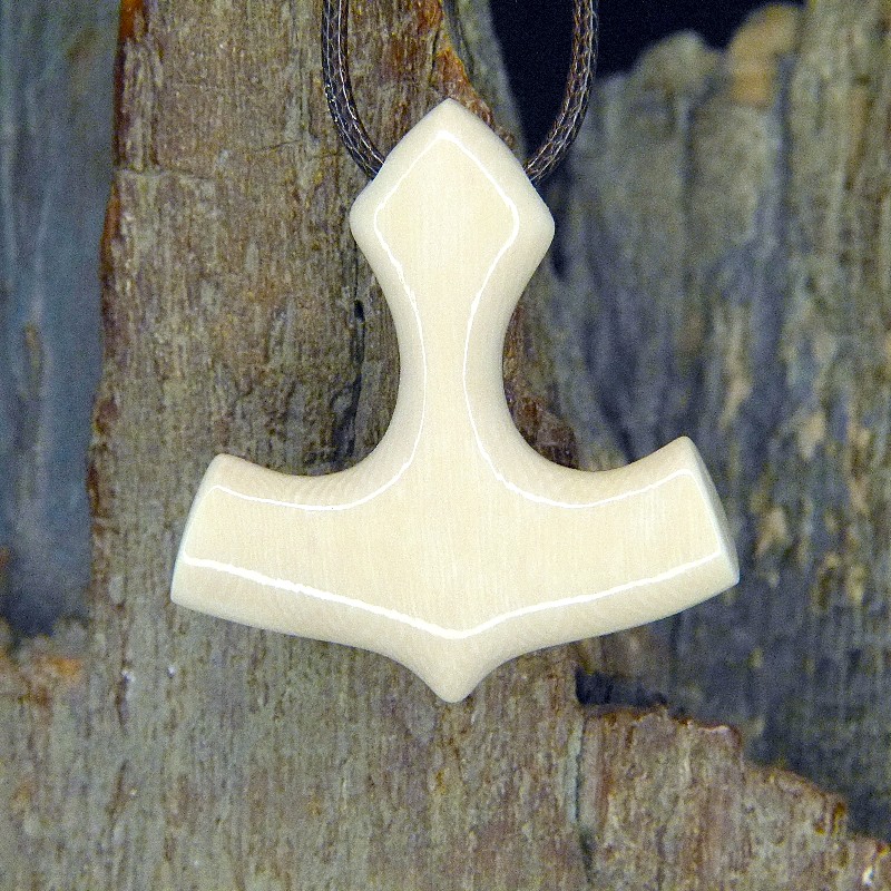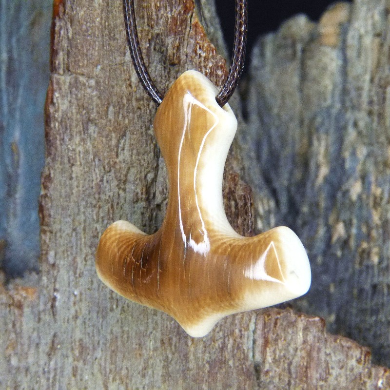 Anhänger in Form von Thors Hammer, gefertigt aus massivem Mammut-Elfenbein mit toller dunkelbrauner Rindenfärbung. Die Rückseite ist natürlich hell und der Anhänger kann beidseitig getragen werden.