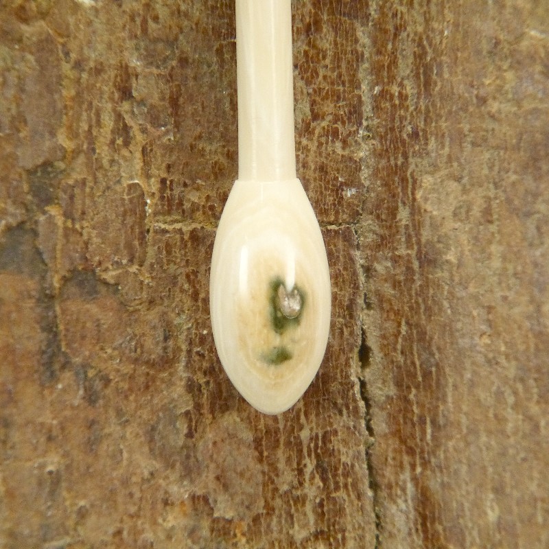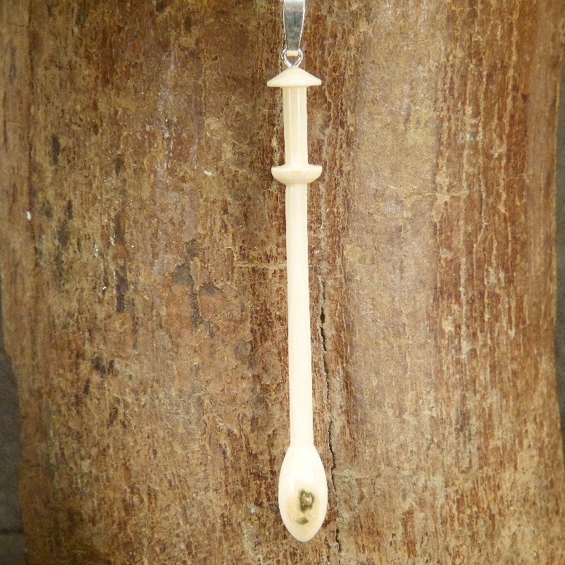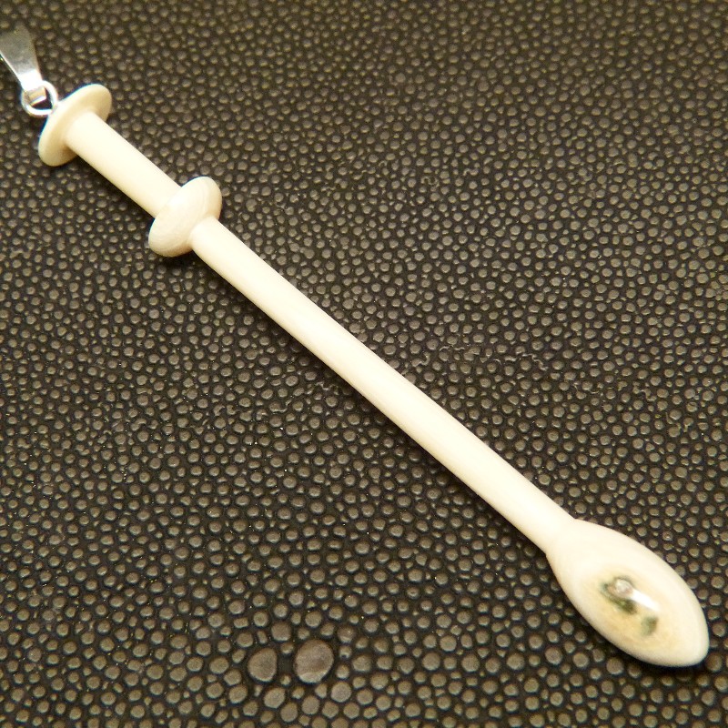 Mammutelfenbein mit schöner Rindenfärbung und einer Länge (ohne Öse) von ca. 84mm bei einem Durchmesser von ca. 9mm.