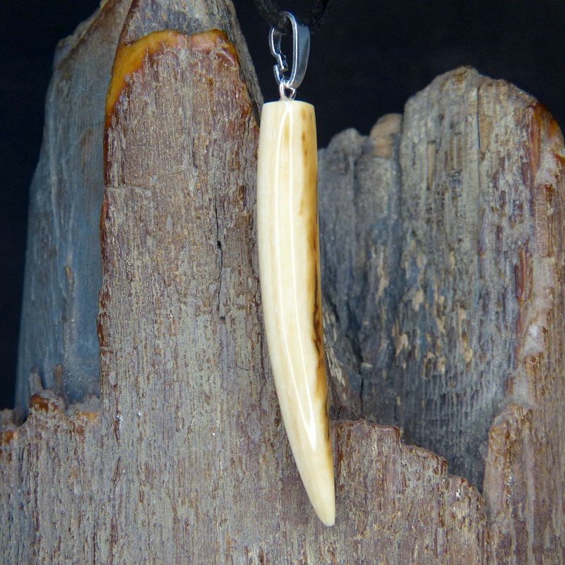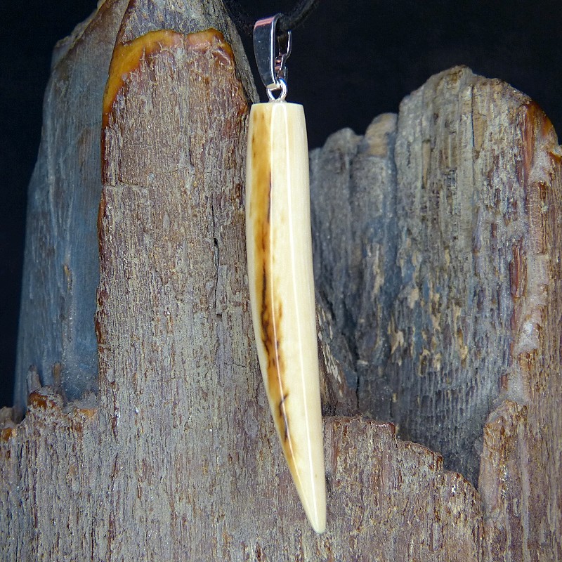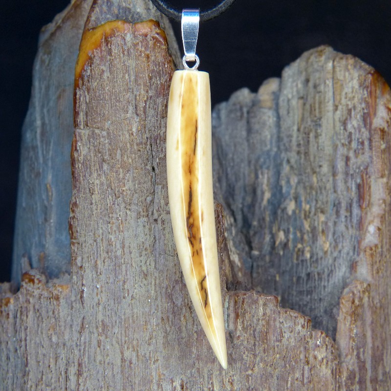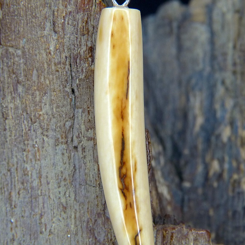 Schlanker Zahnanhänger aus Mammut-Elfenbein mit schöner Rindenfärbung und feiner Maserung.