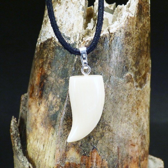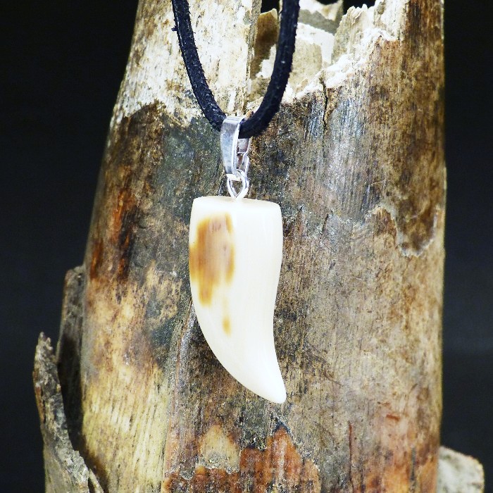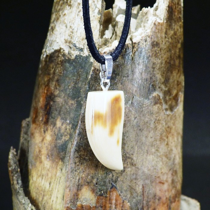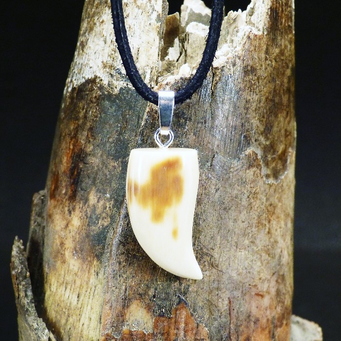 Kleiner Zahn-/Krallenanhänger aus cremefarbenem Mammut-Elfenbein mit brauner Färbung und einer Länge (ohne Öse) von ca. 25 mm, einer Breite und Dicke von ca. 14 x 8,5 mm.