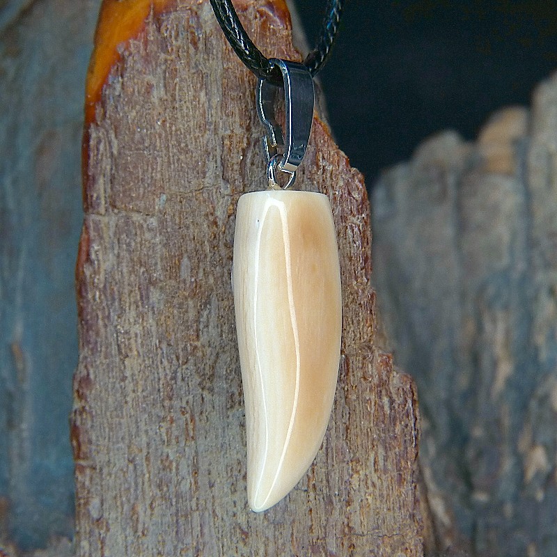 Zahnanhänger aus cremiegem Mammut-Elfenbein mit leicht bräunlicher Rindenfärbung.