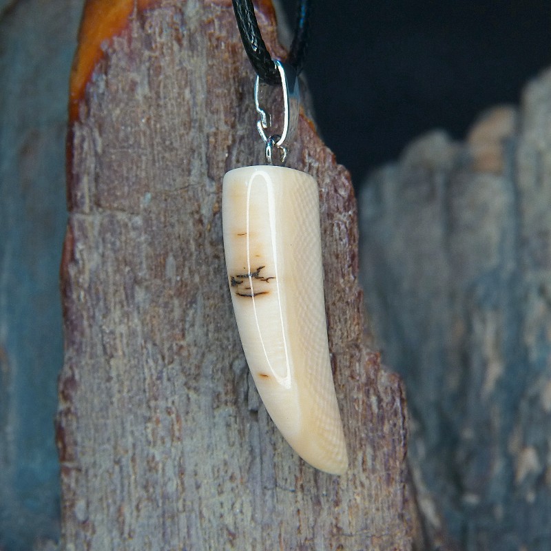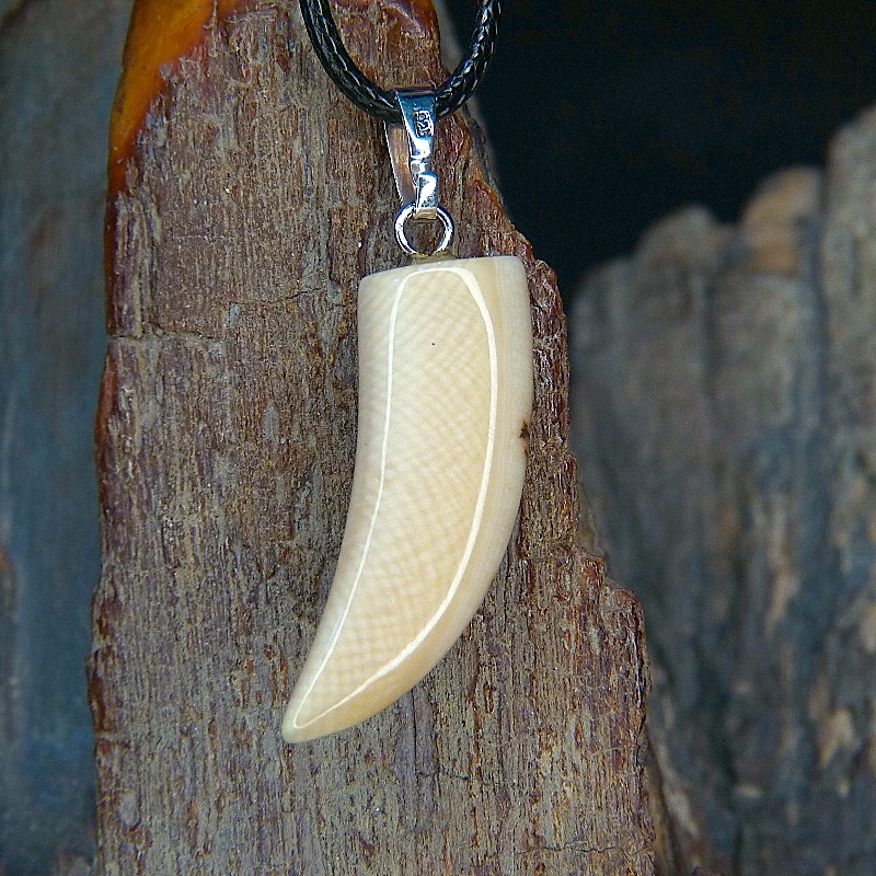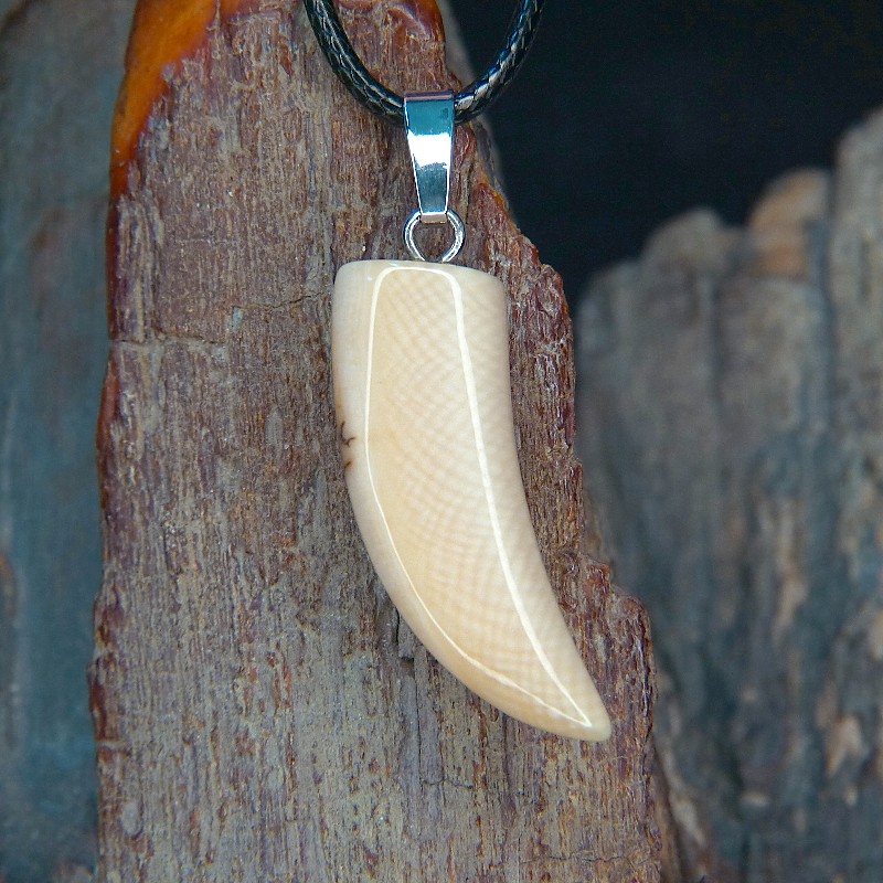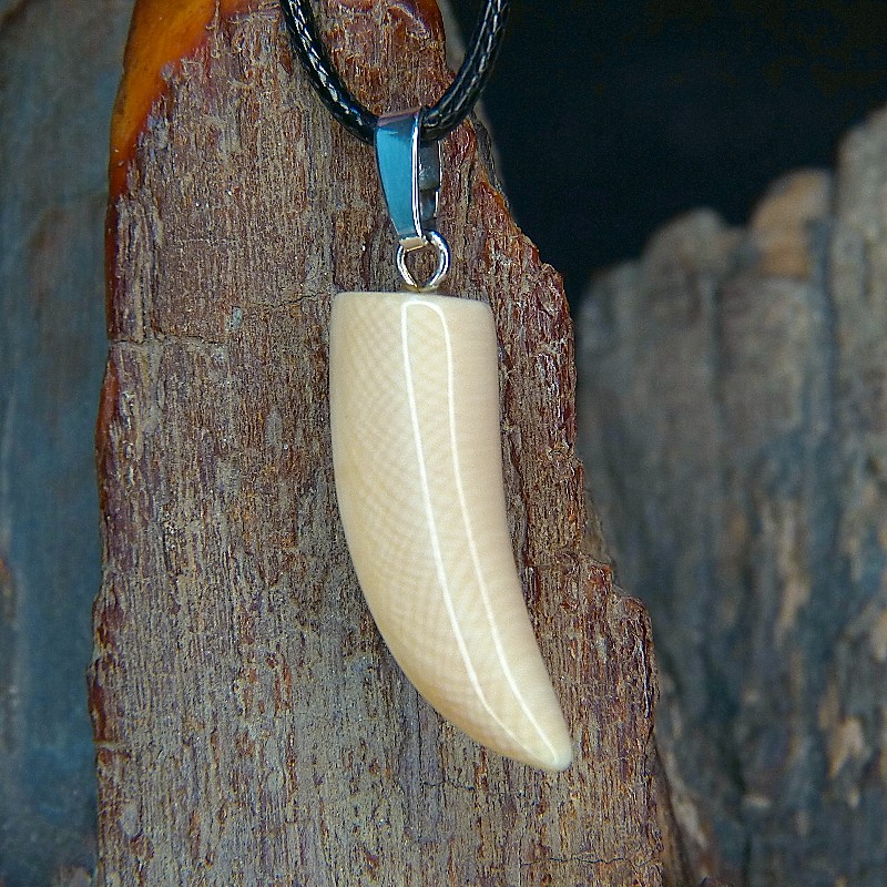 Zahnanhänger aus cremigem Mammut-Elfenbein mit starker Maserung und leichter Rindenfärbung.